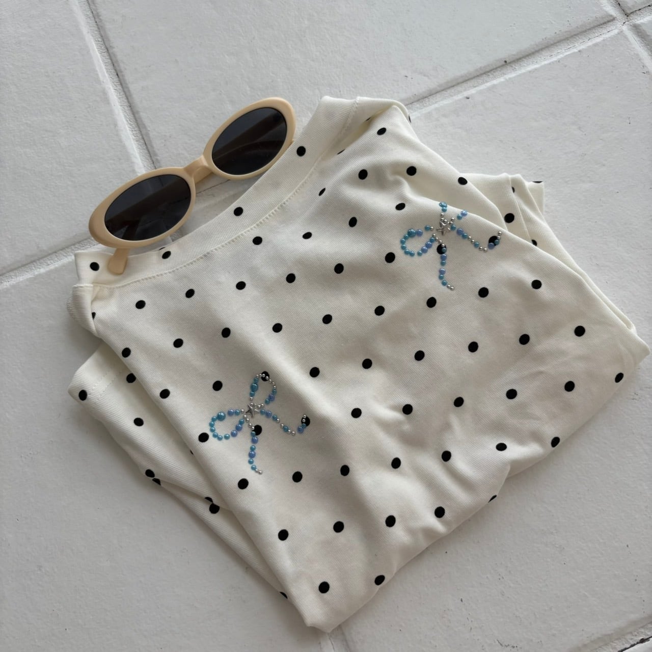 ドット柄がキュートなストーンタイトTEEです! 柔らかなコットン素材で、伸縮性があり、着心地も抜群。カジュアルスタイルにも、スカートやパンツでのコーディネートにも最適なアイテムです♡ストーンがチャームポイントになって、キラッと輝く可愛い1枚です♡