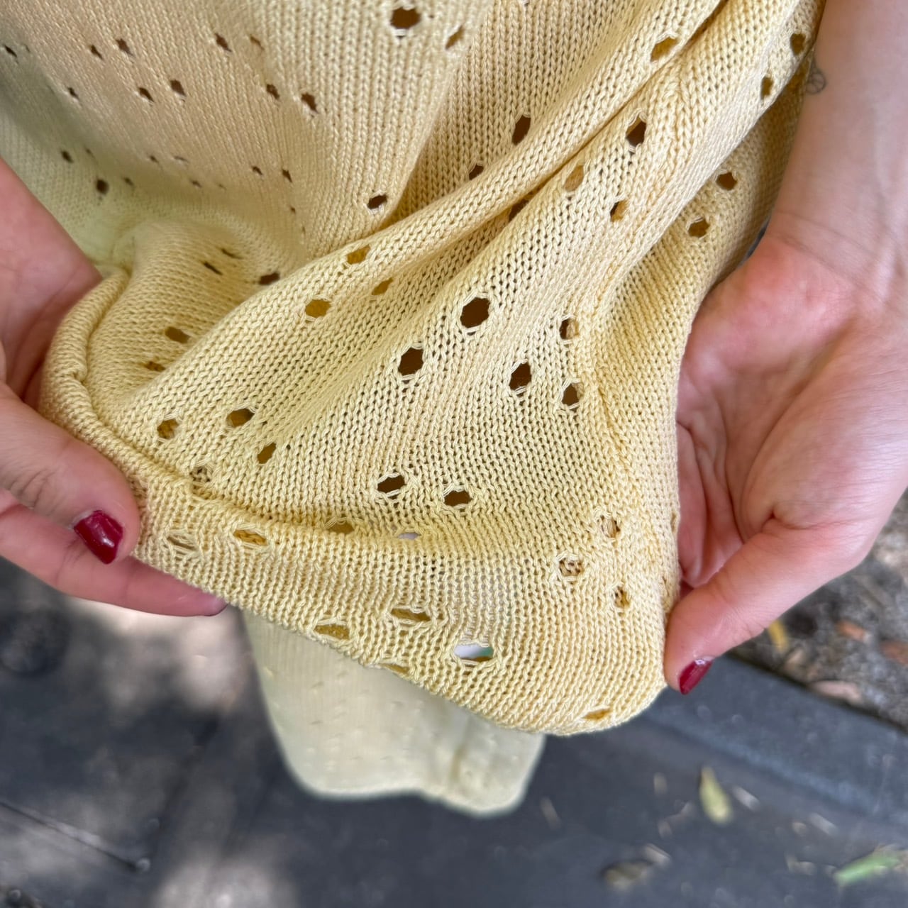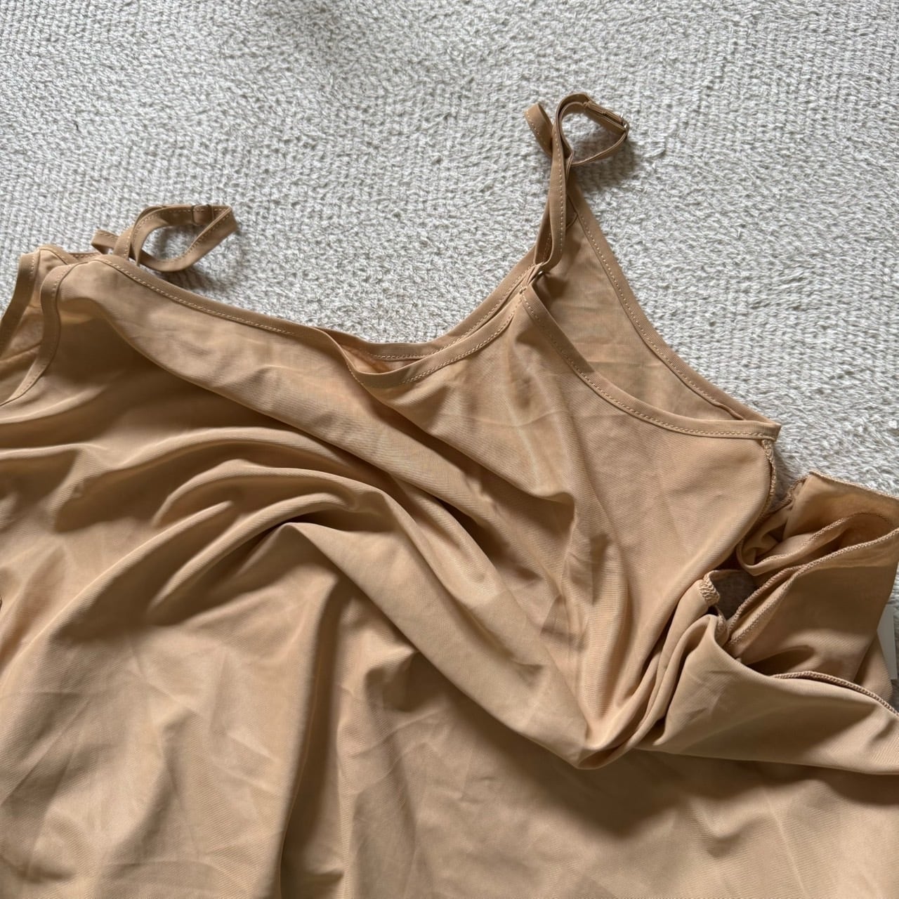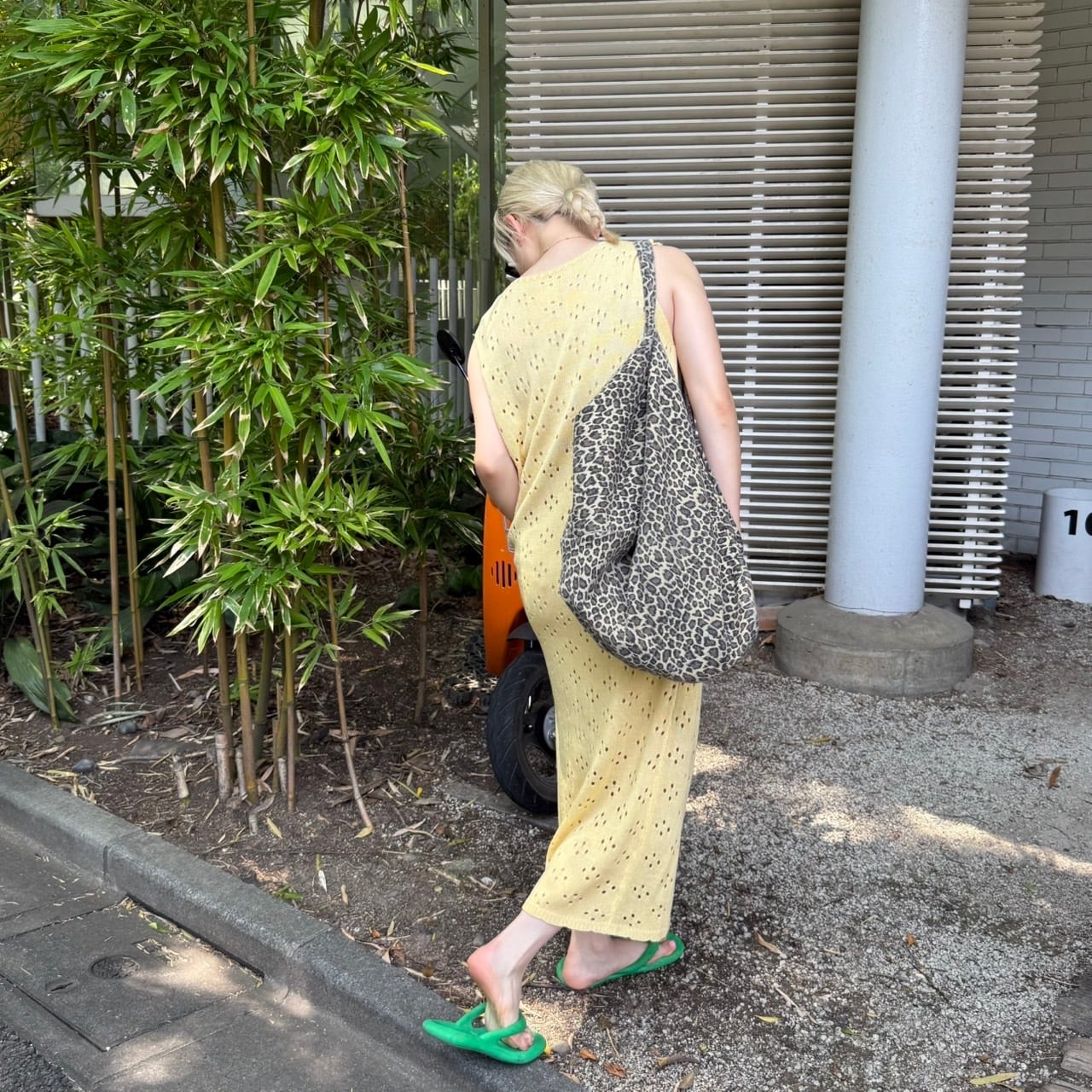柔らかなニット素材を使用し、肌触りも良く、軽やかな着心地が魅力のロングワンピースです。脇の部分はゆとりがあり、腕のカバーにもなります。下に着用するベージュのワンピースもセットになっているので、ワンピース単体で着用していただけます。