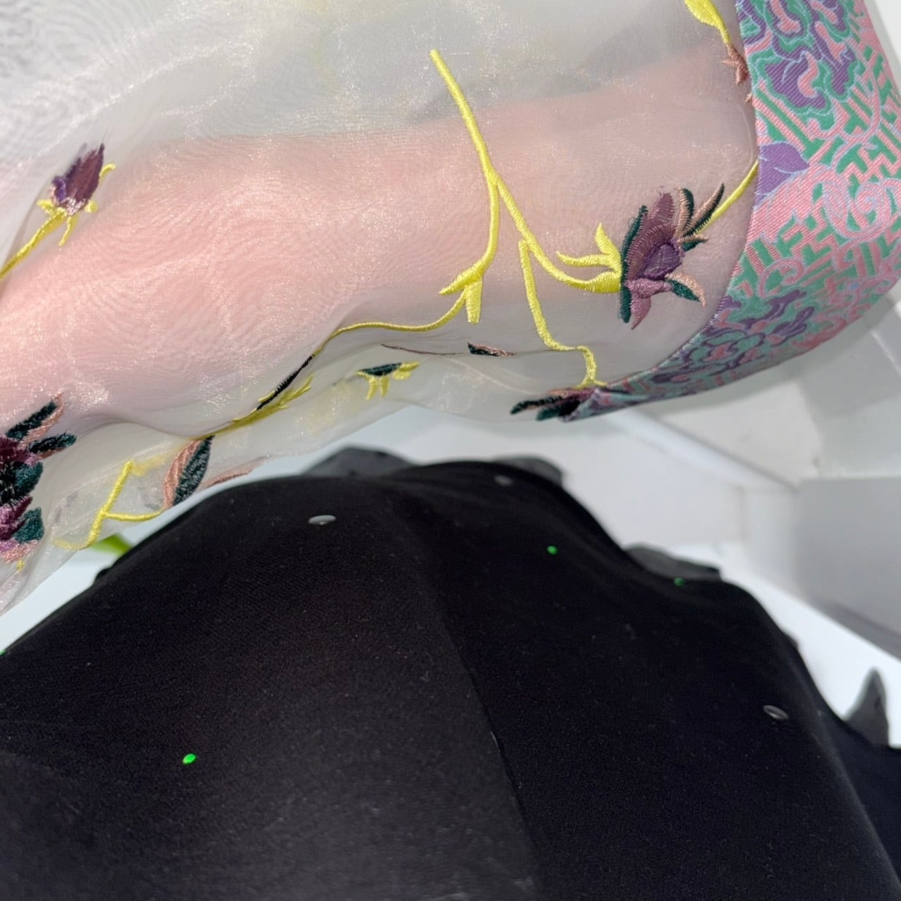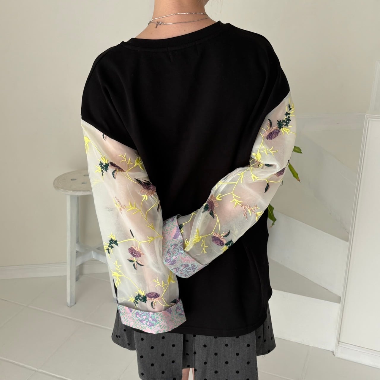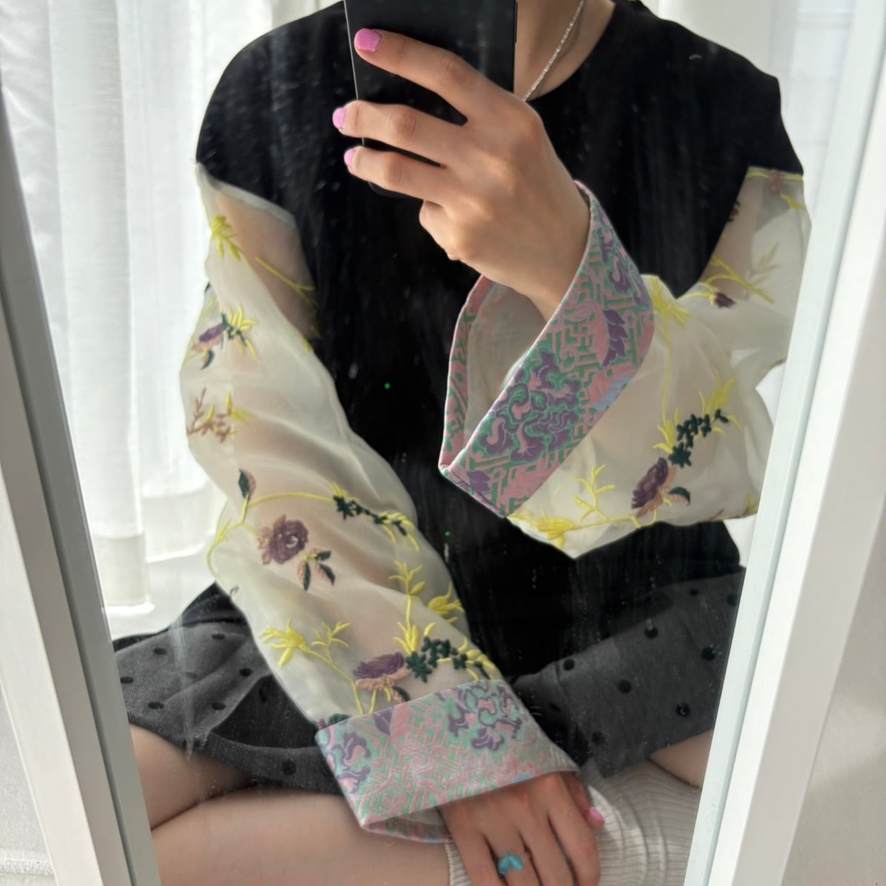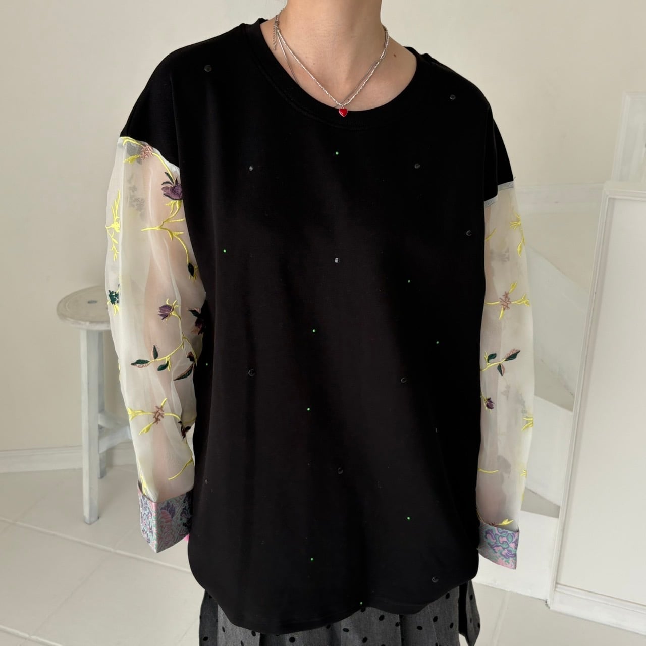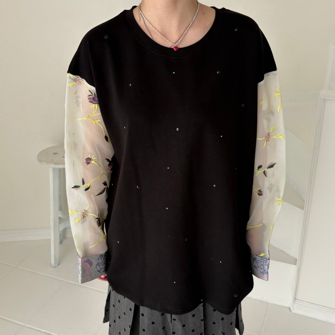 ラフでありながら洗練されたデザインのスリーブスウィッチロングカットソーが登場✨シアーに刺繍が施された珍しい1枚で、裾の切り返し部分の生地も違い、全てのデザインがとても細かく縫製された個性派トップスです。ゆったりとしたサイズの造りで、たくさんの方に着用していただけます。フロントのストーンも可愛くて、大人が楽しめる個性派トップスです。