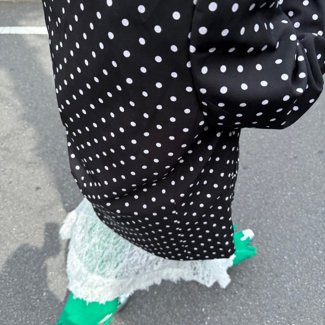 ブラックのジャケットと相性抜群のパキッとグリーン💚レースをドッキングして梅雨っぽい雰囲気に。