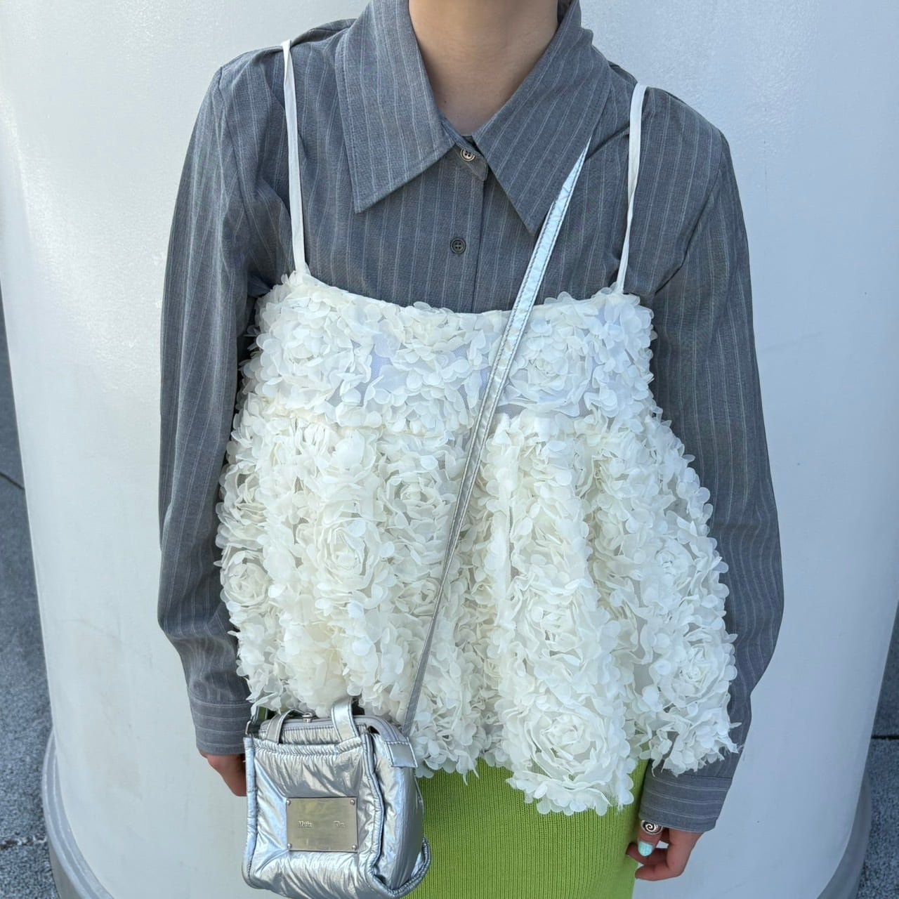 花びらのようなディティールで高級感のある1枚。シャツに合わせたり、これからの時期は1枚で着用するのもおすすめ。デートや女子会にぜひ♡