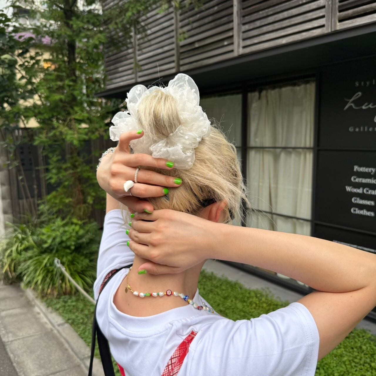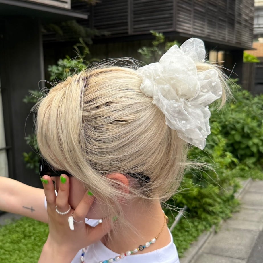 ふんわりとしたシアー素材で可愛らしさを演出するシュシュ♡ドット柄がシンプルながらも個性的で、髪にさりげなくアクセントを加えてくれます☺︎カジュアルスタイルはもちろん、ちょっぴり特別なお出かけにもぴったりのアイテム♡