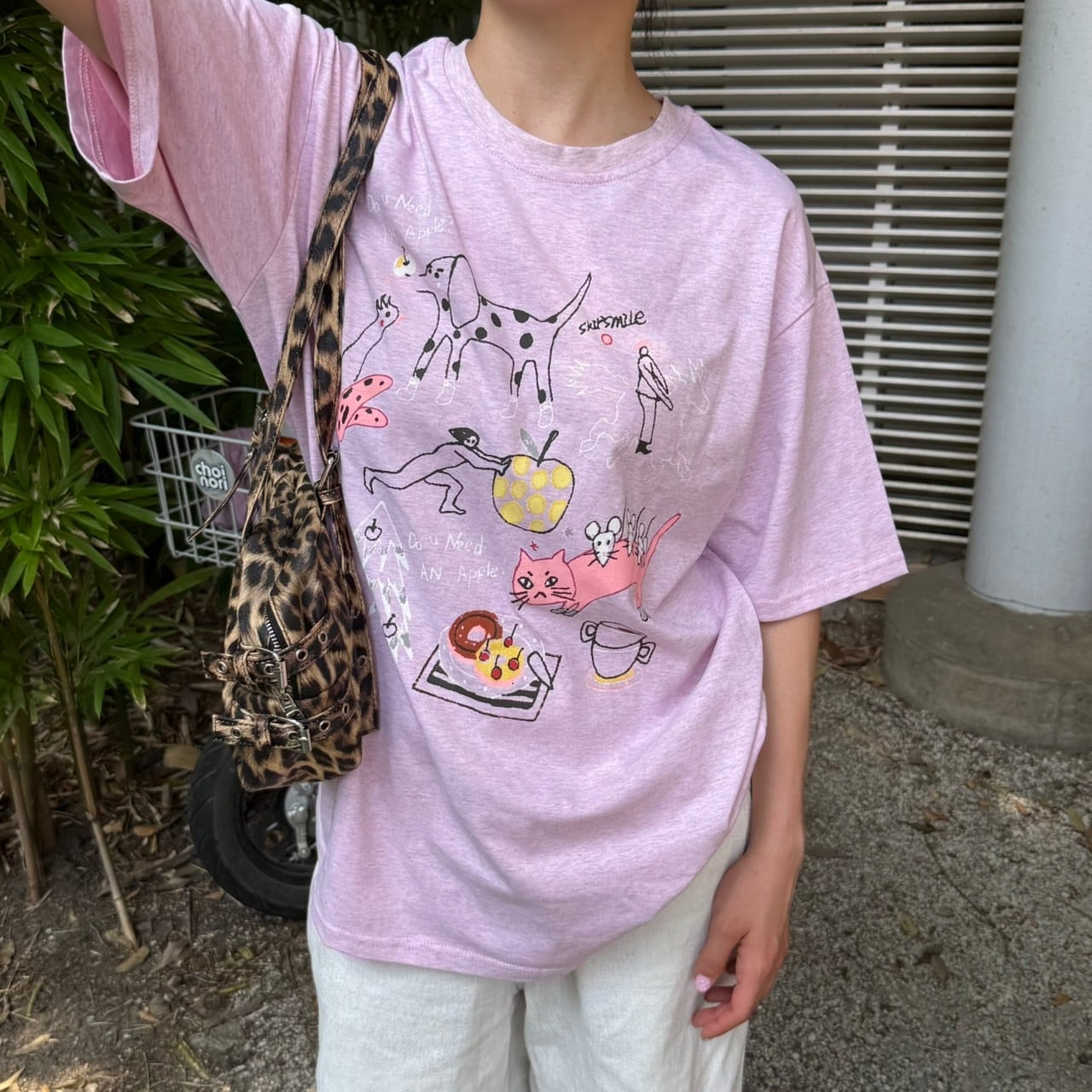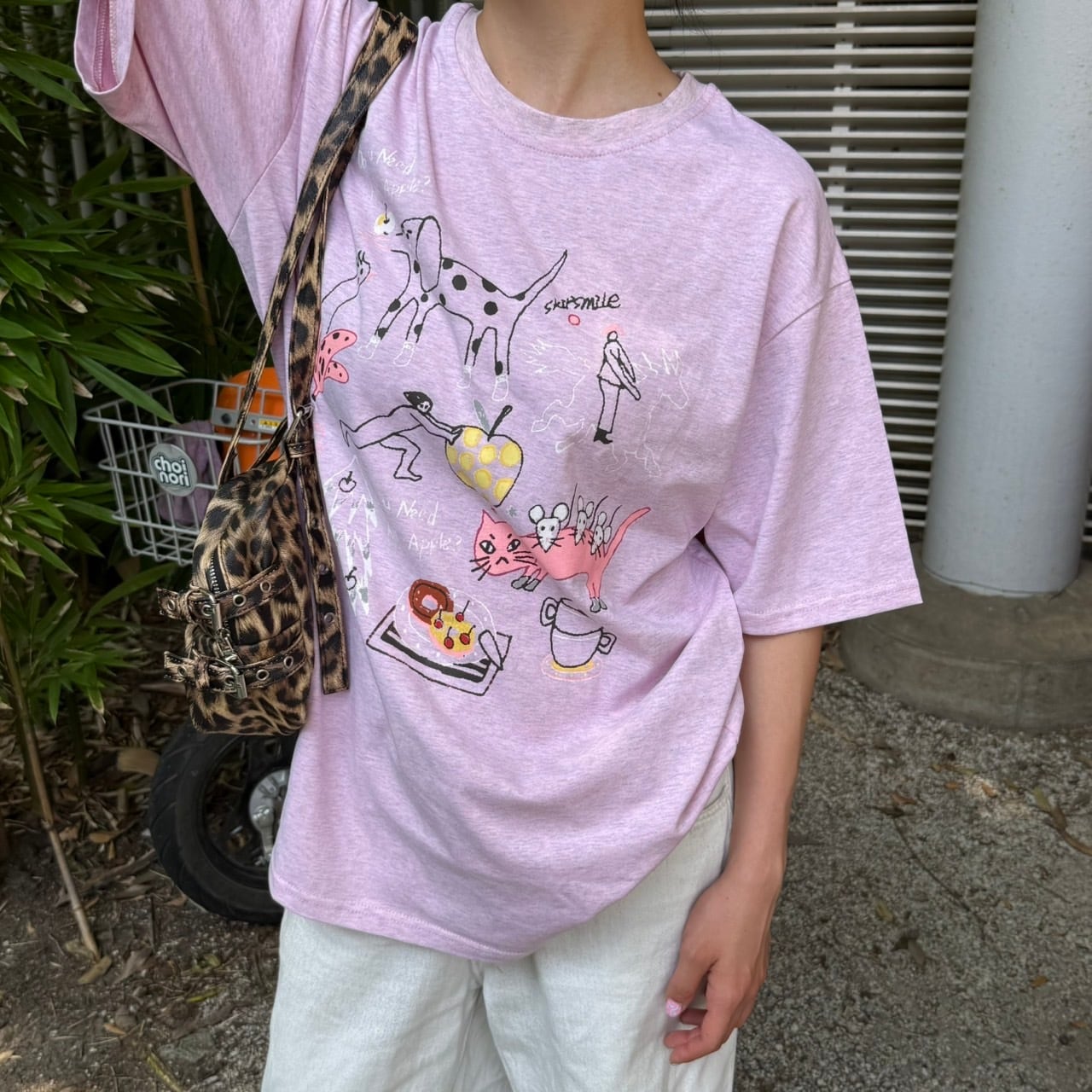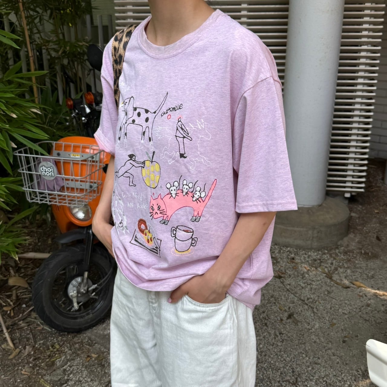 淡いピンクのカラーが中々見ない色で、Tシャツに直接お絵描きしたようなイラストがユニークなデザイン性ばっちりの1枚★薄すぎず、厚手すぎないしっかりとした生地のTシャツです。ペラッとしていないので、このユニークさがありながら、高級感も見られるような印象があります。