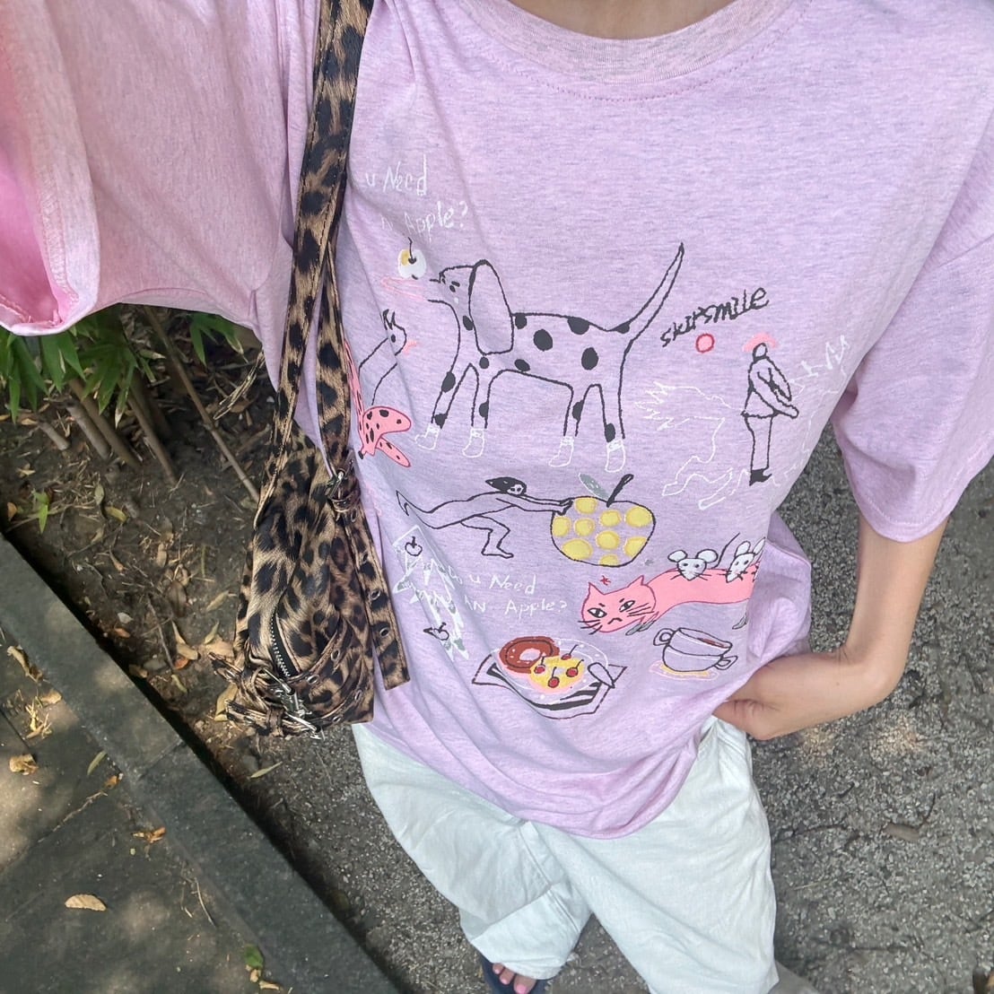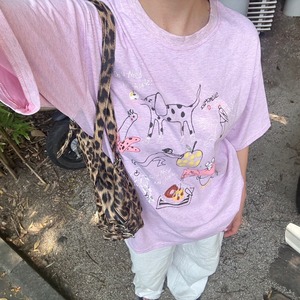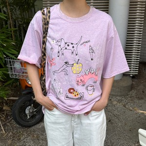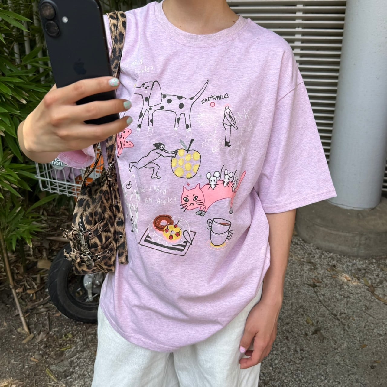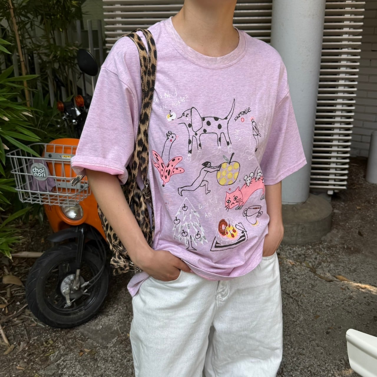 淡いピンクのカラーが中々見ない色で、Tシャツに直接お絵描きしたようなイラストがユニークなデザイン性ばっちりの1枚★薄すぎず、厚手すぎないしっかりとした生地のTシャツです。ペラッとしていないので、このユニークさがありながら、高級感も見られるような印象があります。