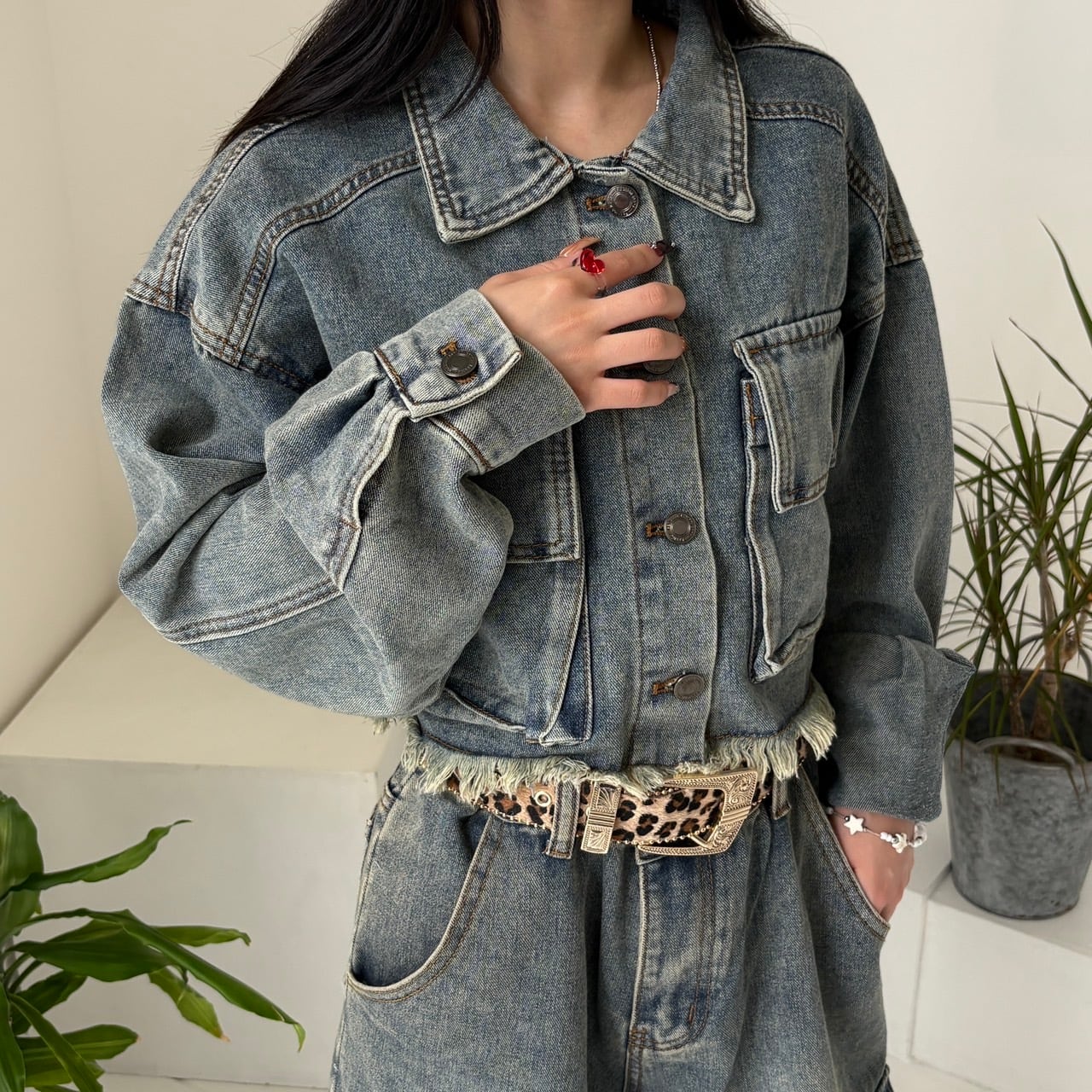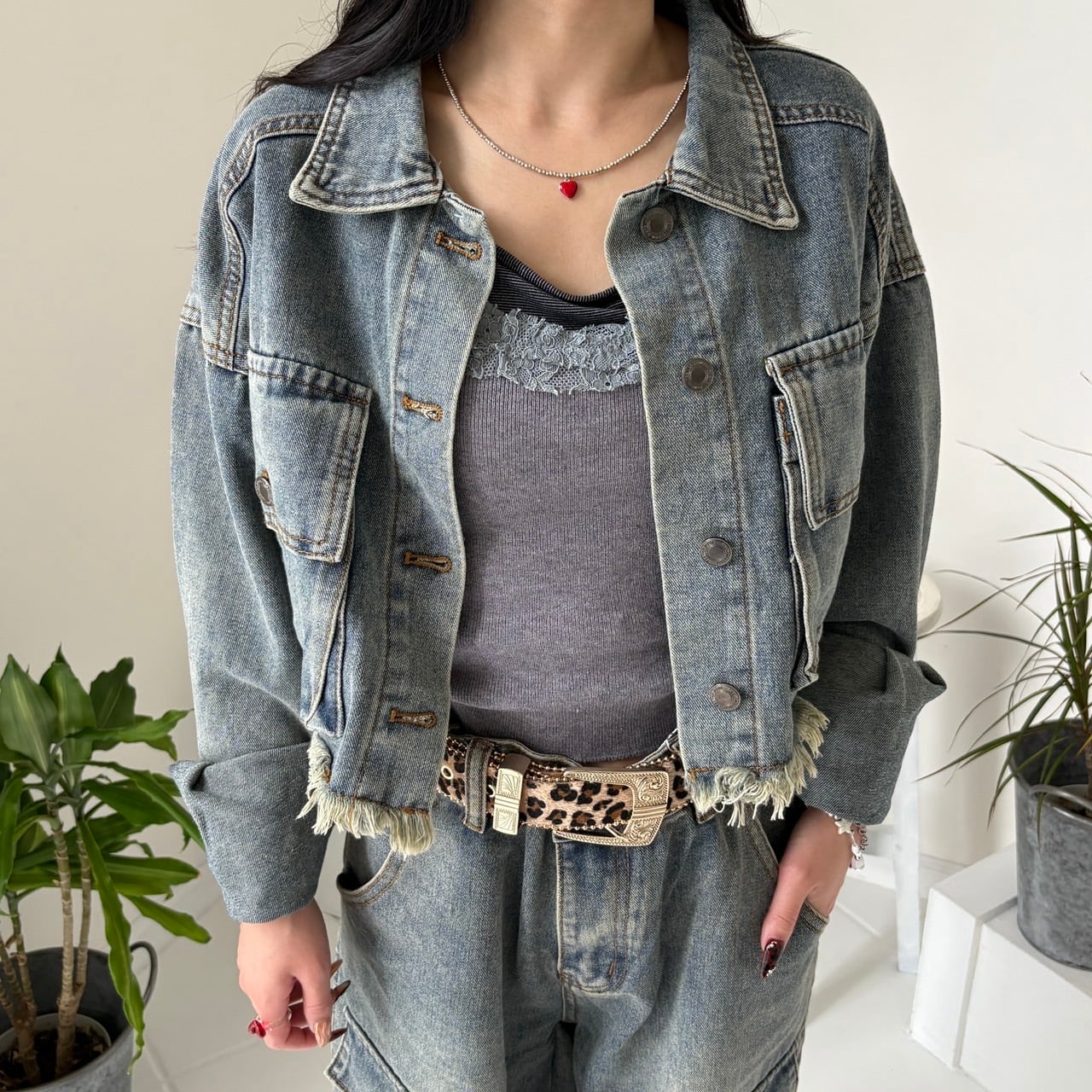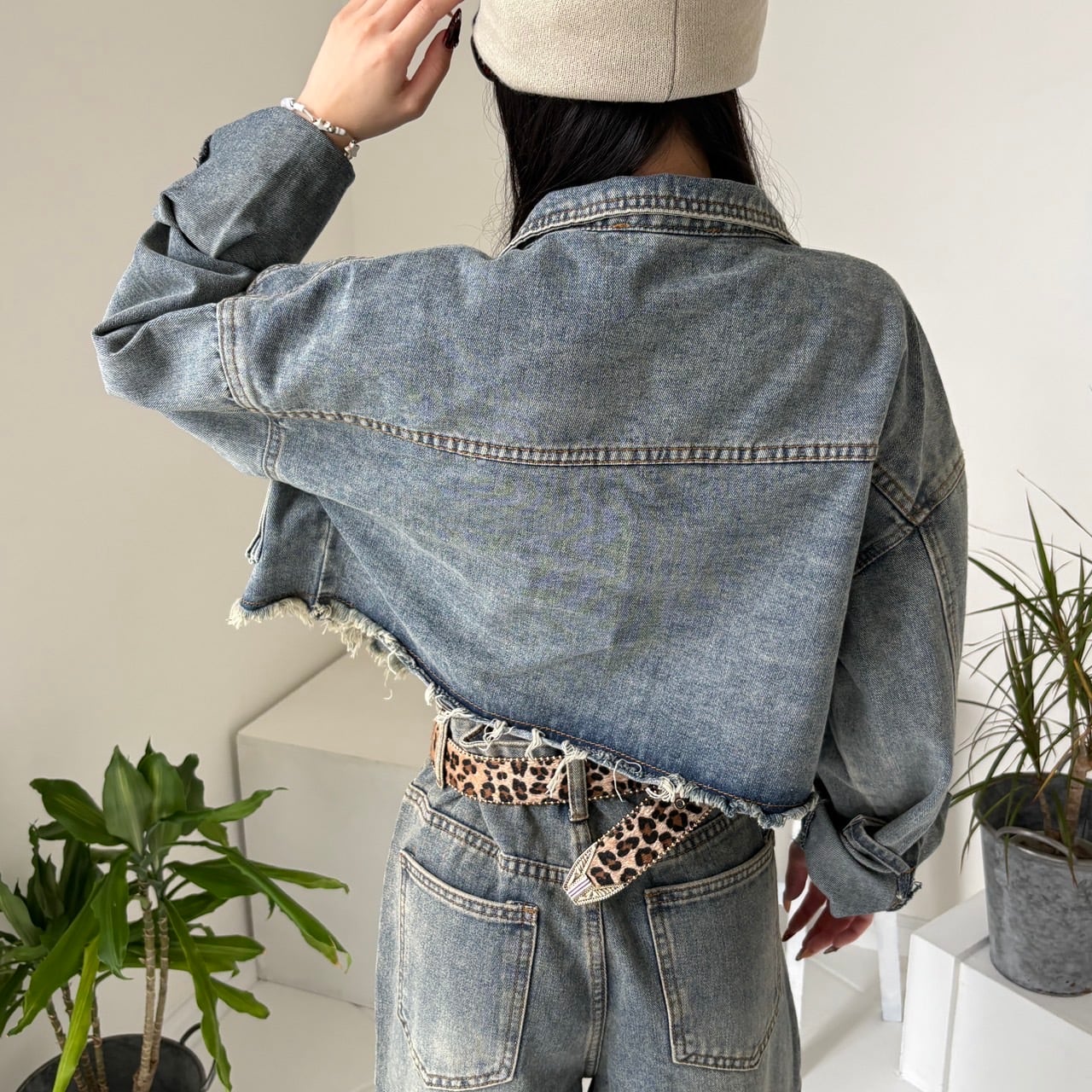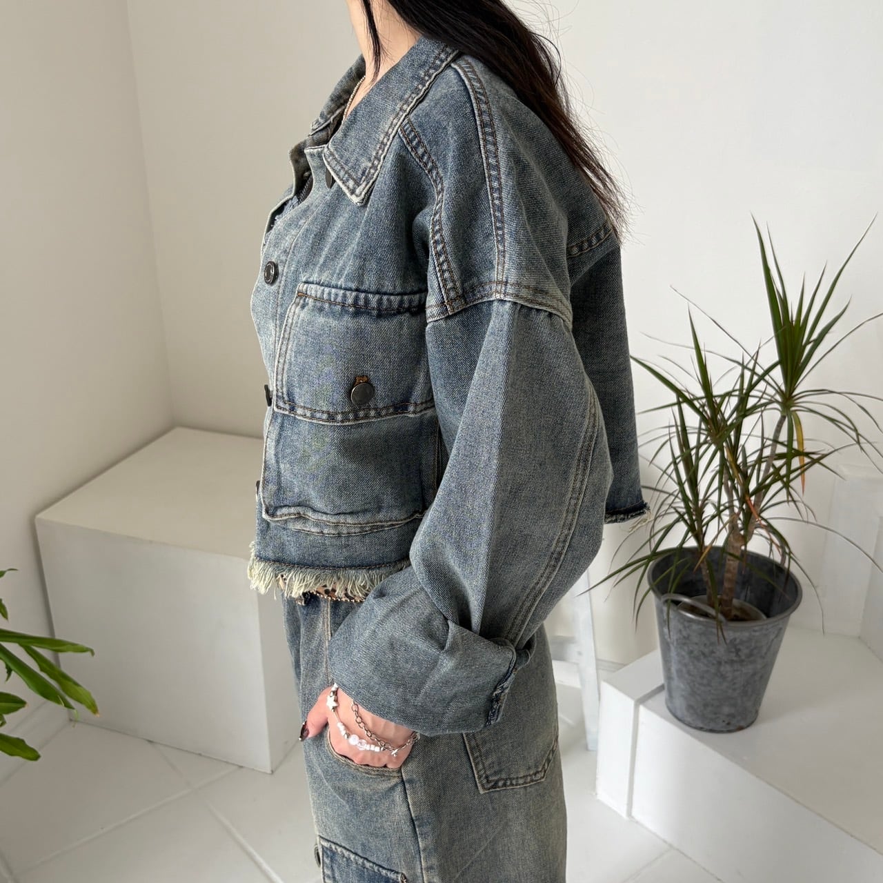 【国内配送】Cropped Fringed Raw Hem Denim Jacket_LN03507