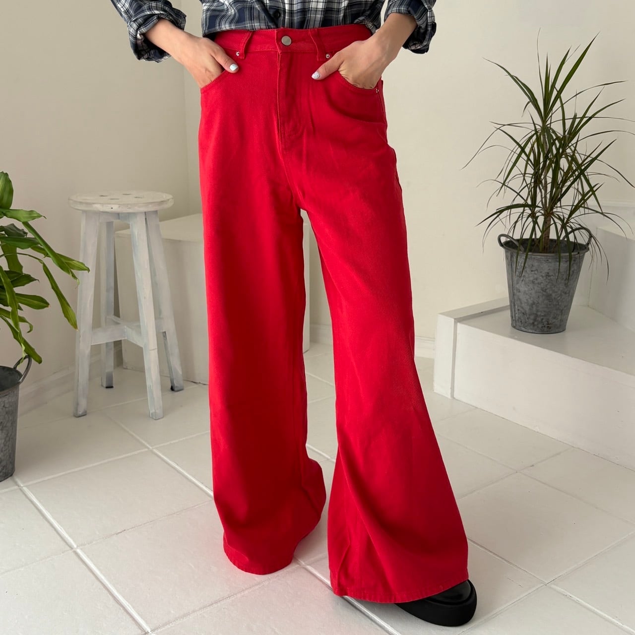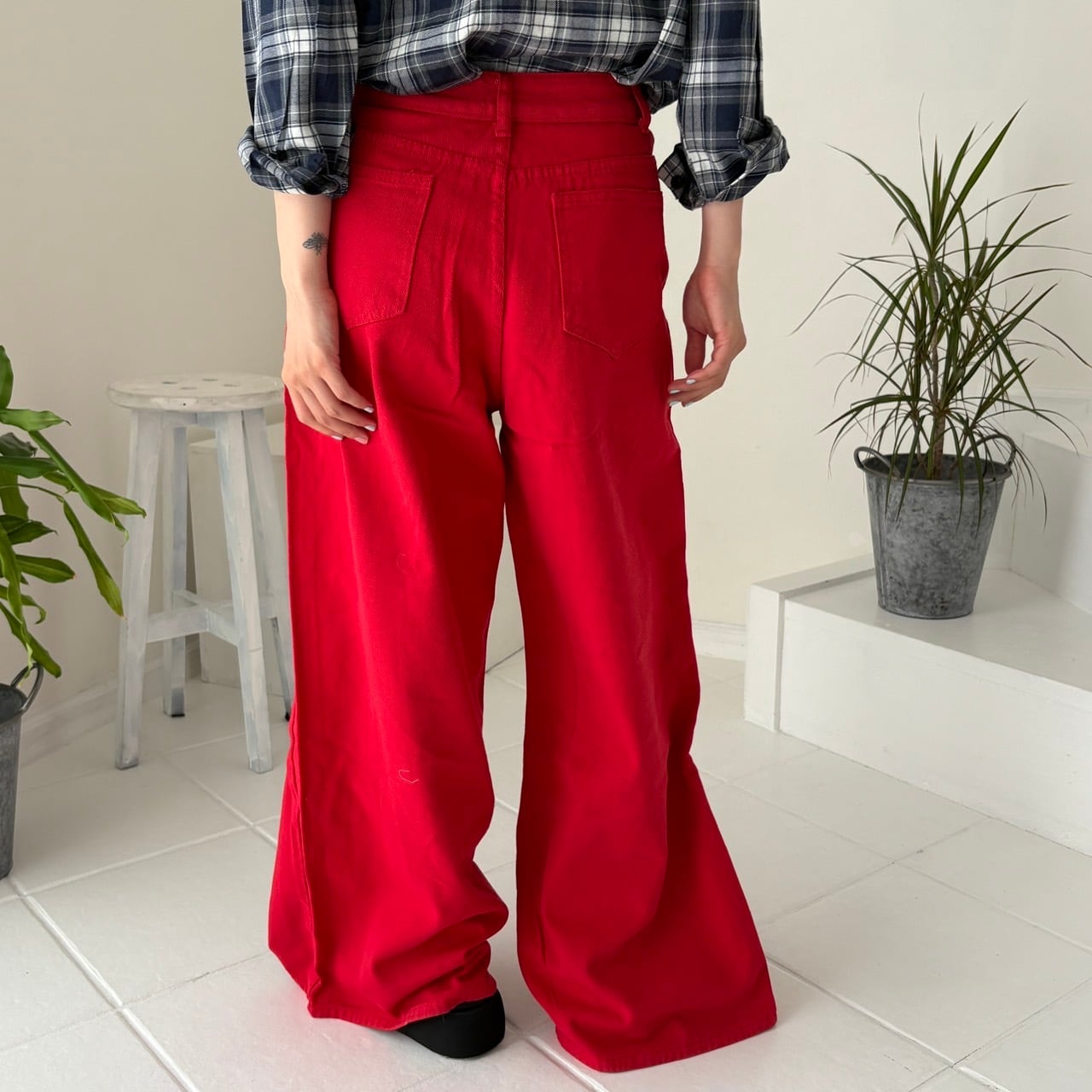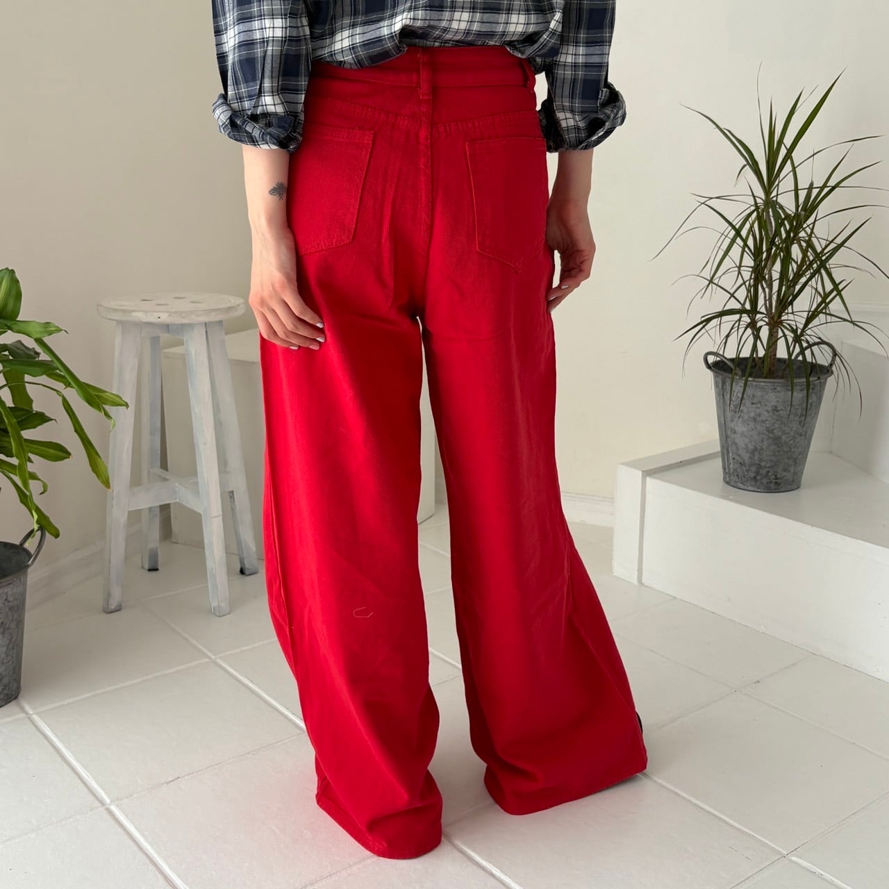 真っ赤なデニムでシンプルなコーデの主役に!分厚すぎず薄すぎない生地間でオールシーズン使えます☺︎裾の溜まり具合と、ストレート×ハイウエストのシルエットで脚長効果も期待できます。