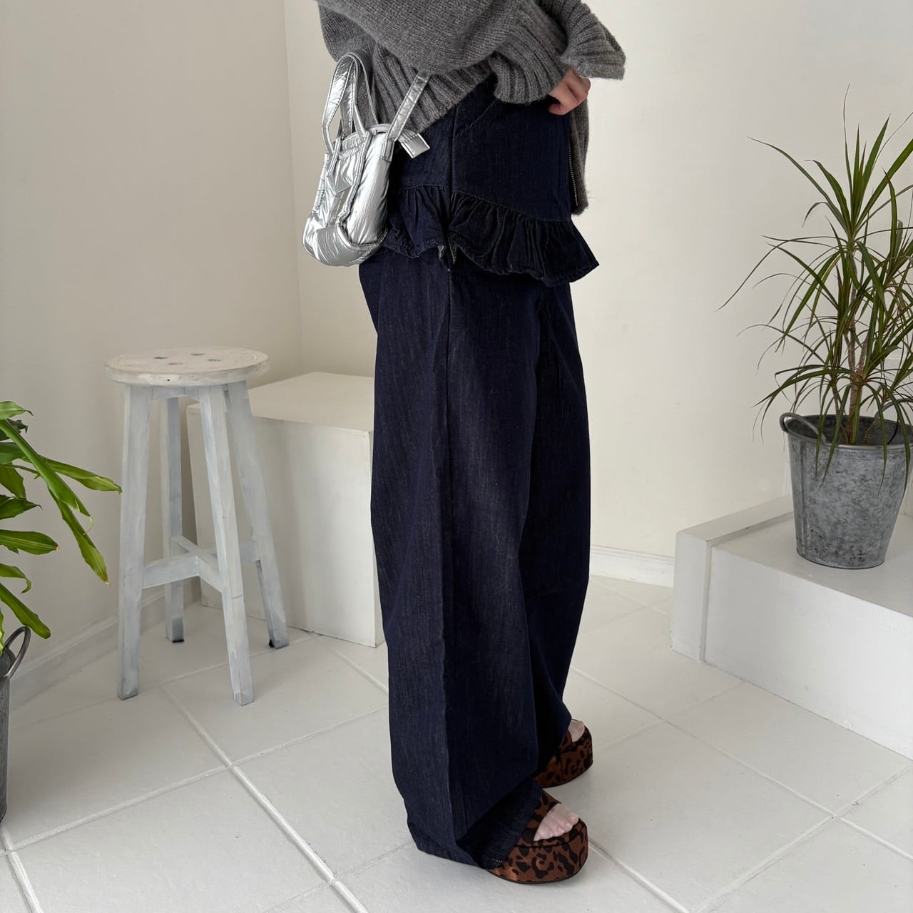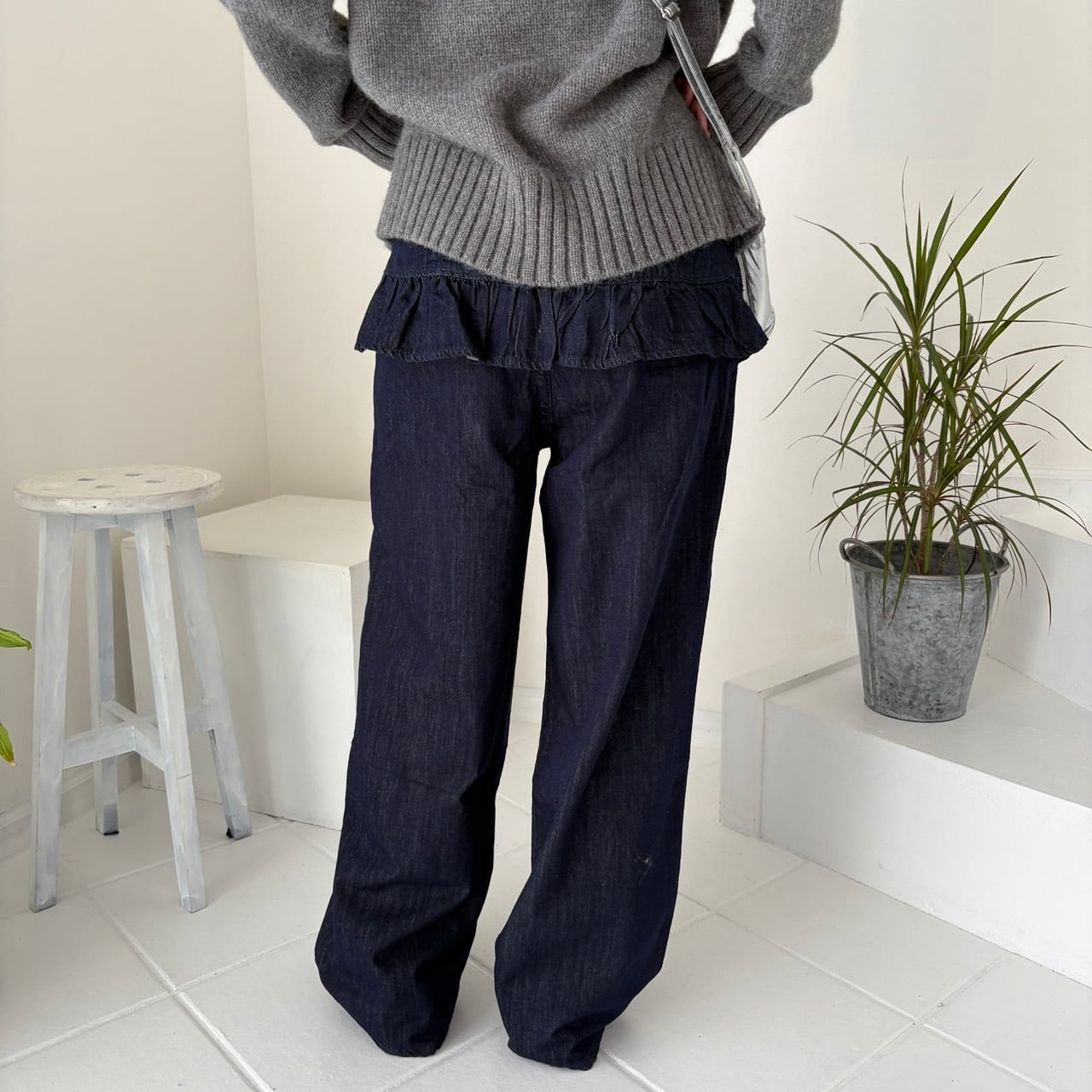 スカートオーバーレイデザインが特長で、一見するとシンプルなストレートレッグジーンズと同時に、スカートの可愛さをプラスした魅力的なアイテムです。軽やかな印象でありながら、脚を綺麗に見せるシルエットを実現しています。
