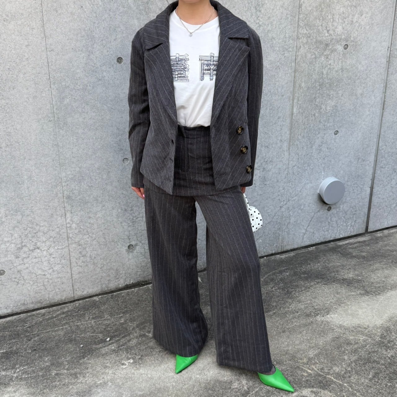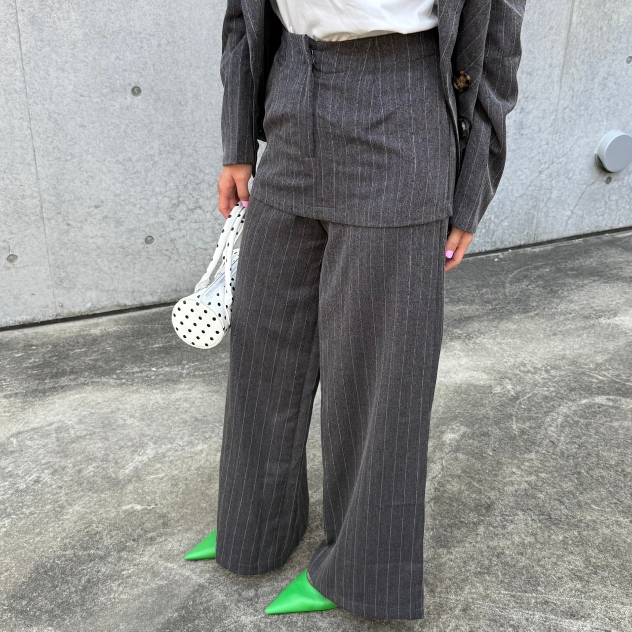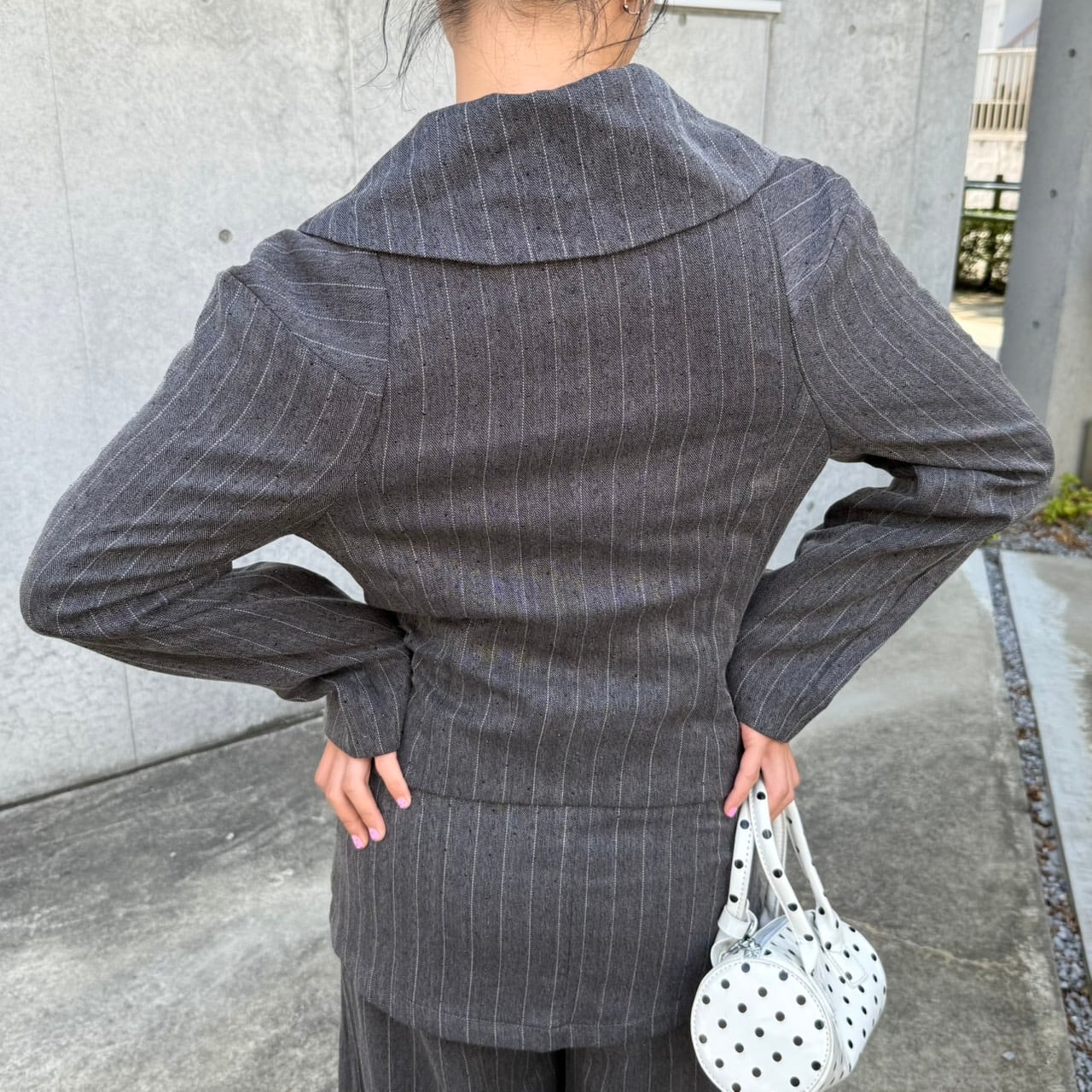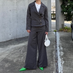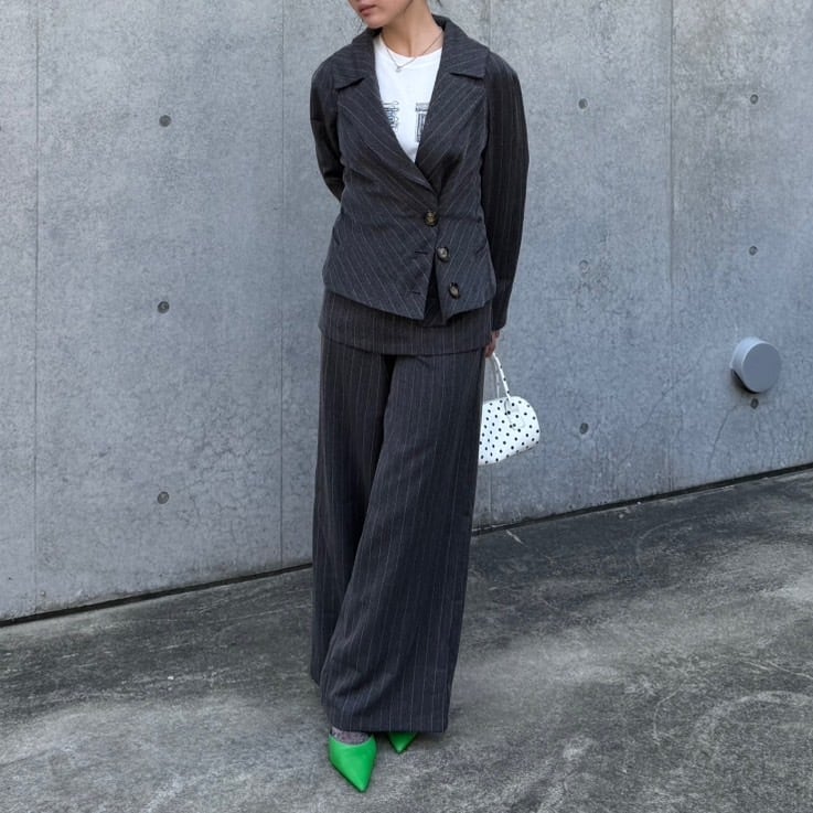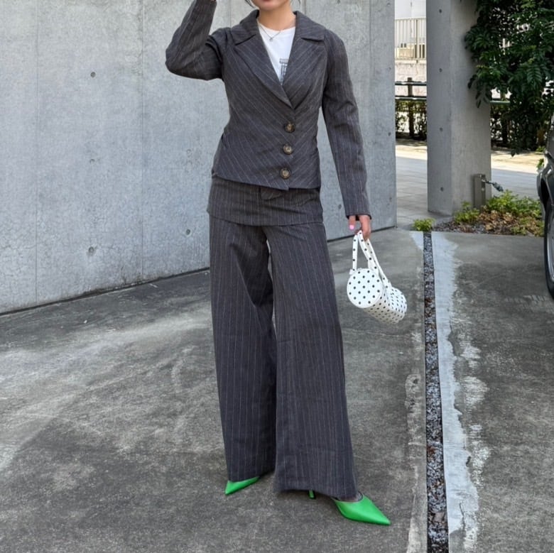 スカート付きのワイドパンツに、身体にフィットする個性的なシルエットのジャケットのセットアイテムです。スタイリッシュなシルエットが魅力の一着♡