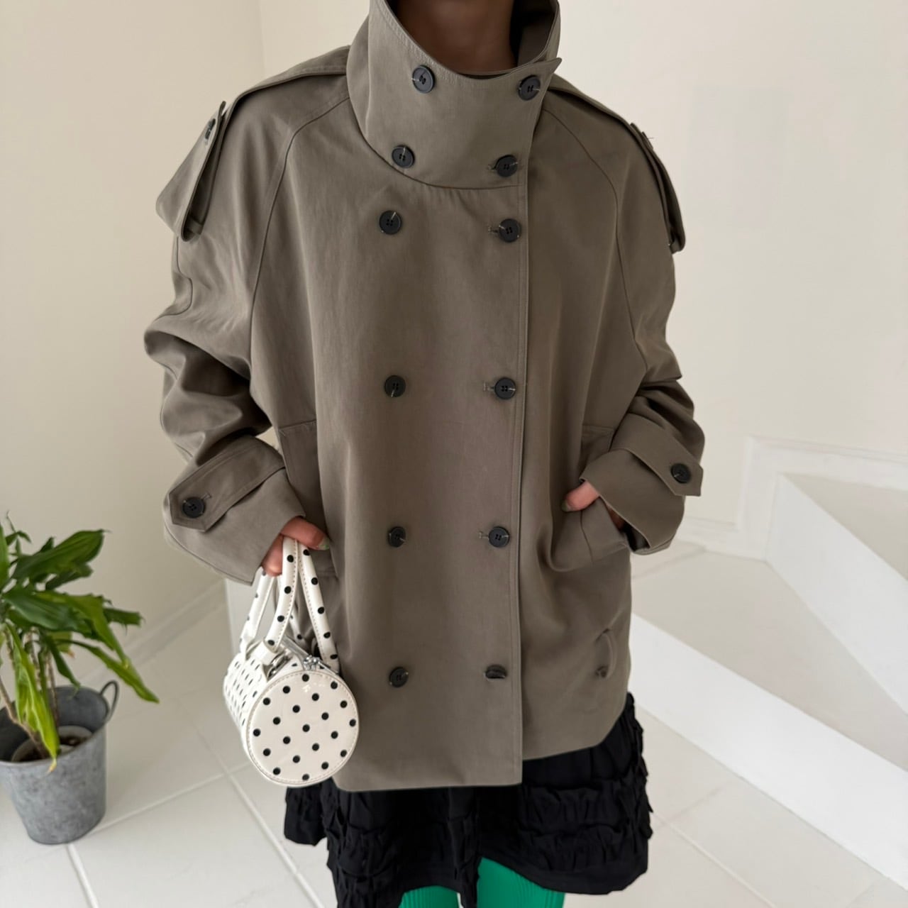 トレンド感溢れるスタンドカラーが特徴のボリュームトレンチジャケット。クラシックなデザインながら、ゆったりとしたシルエットが現代のスタイルにぴったりフィット☺︎