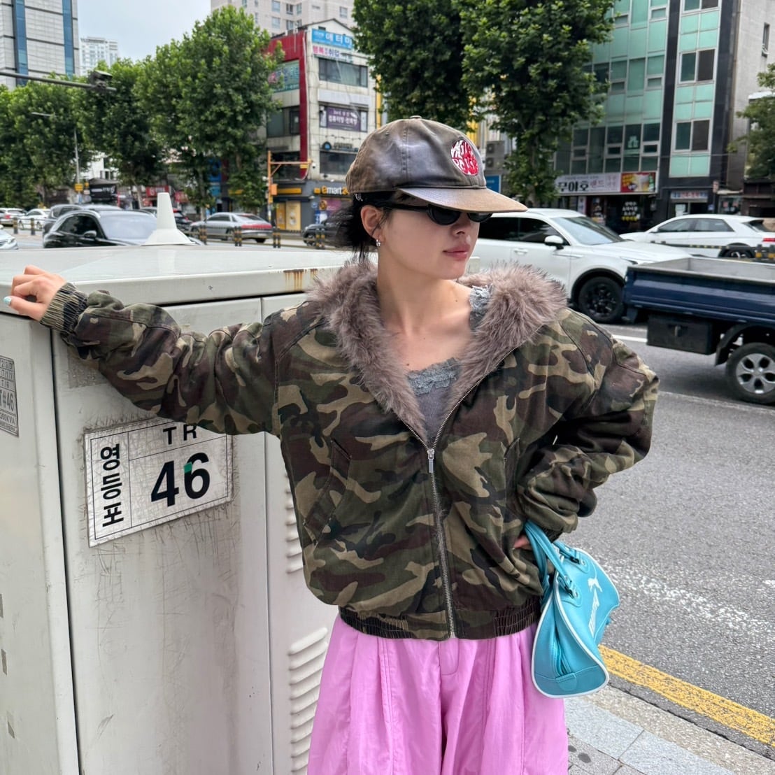 迷彩柄が個性的で、一目で目を引くボリュームファーフード付きブルゾンジャケット。アクティブな日常にも、カジュアルなお出かけにもぴったりなスタイルを演出します。
