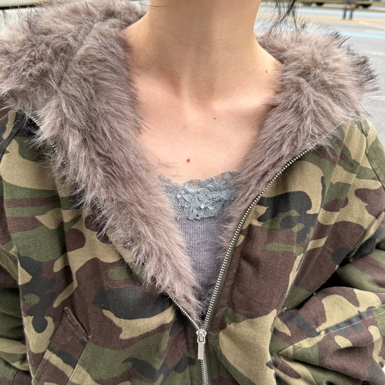 迷彩柄ボリュームファーフード付きブルゾンジャケット_LN03551