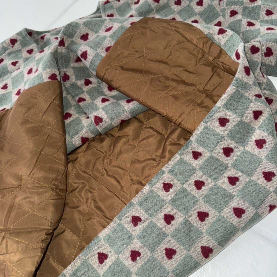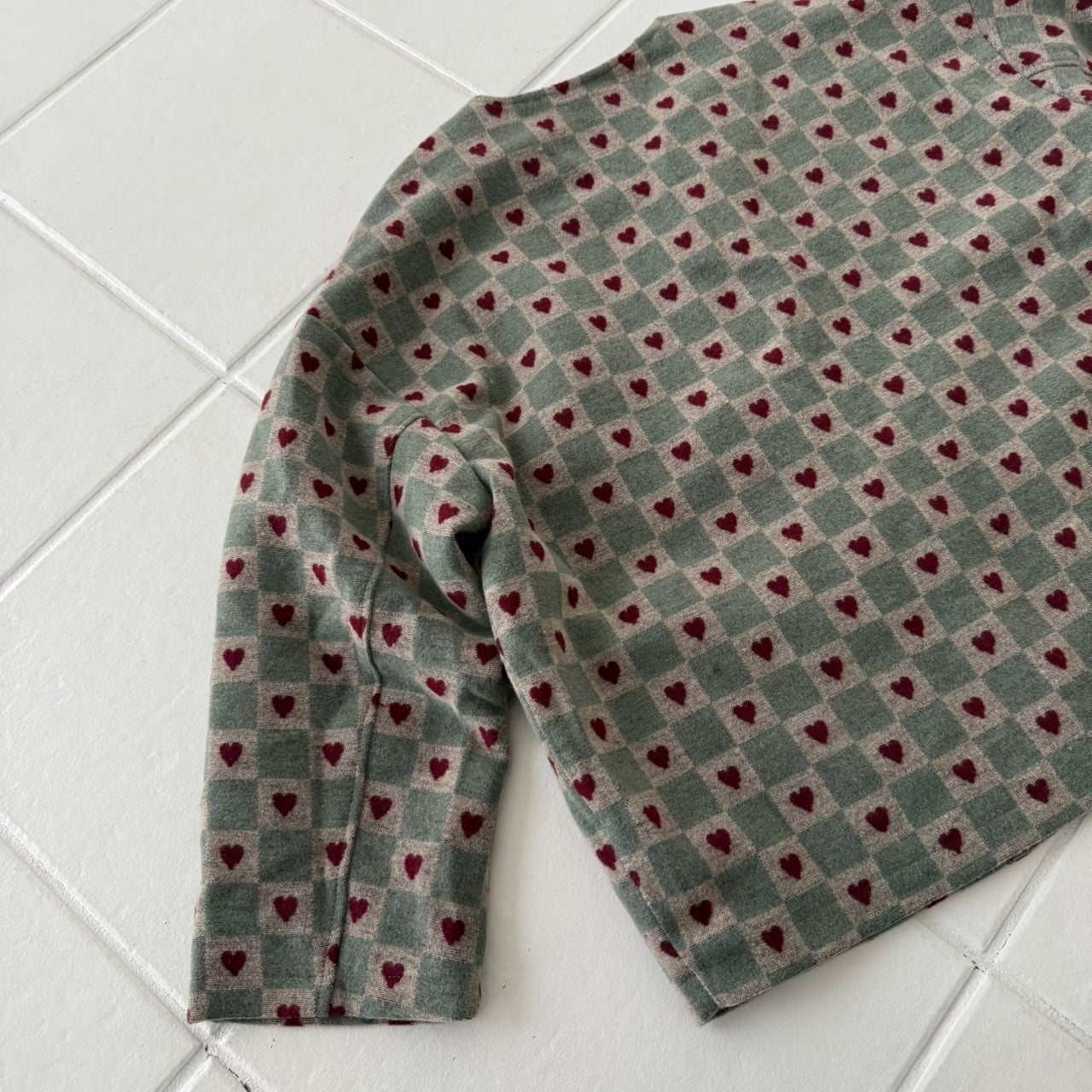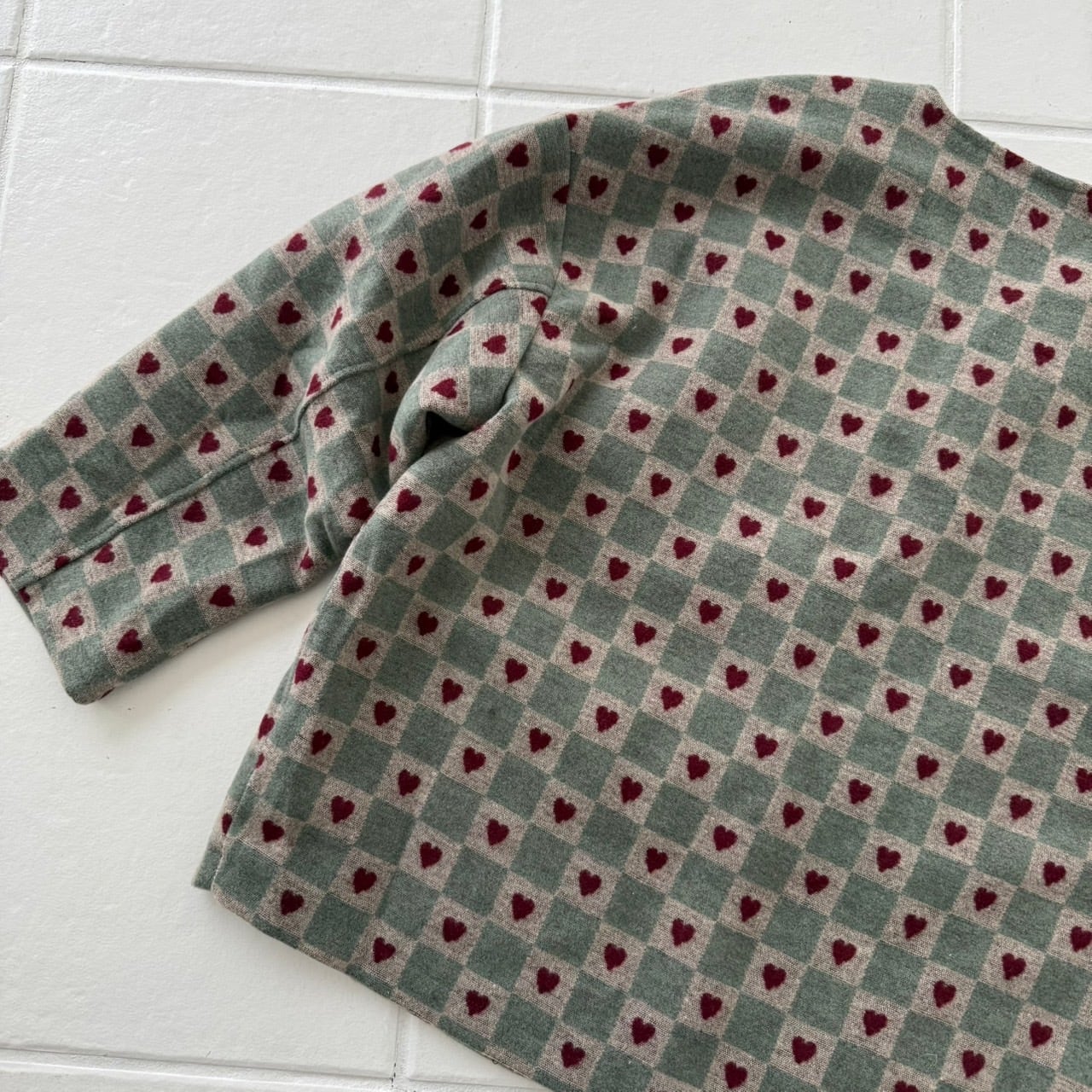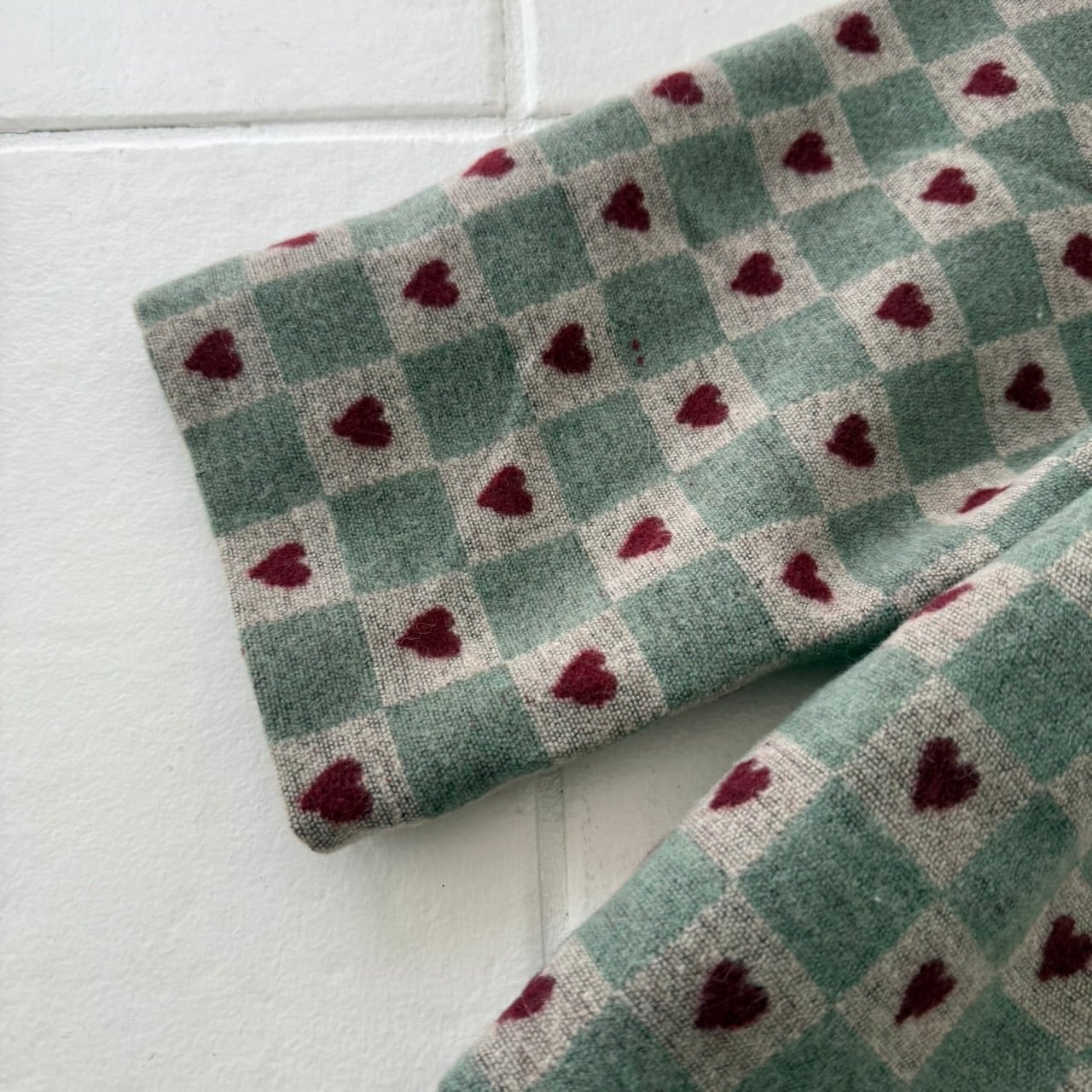クラシカルなブロックチェックの中に、小さなハートを散りばめた個性的なテキスタイル。あえて少し“くすんだ”色味にすることで、甘くなりすぎず、ヴィンテージのお洋服のような独特の雰囲気に仕上げています。