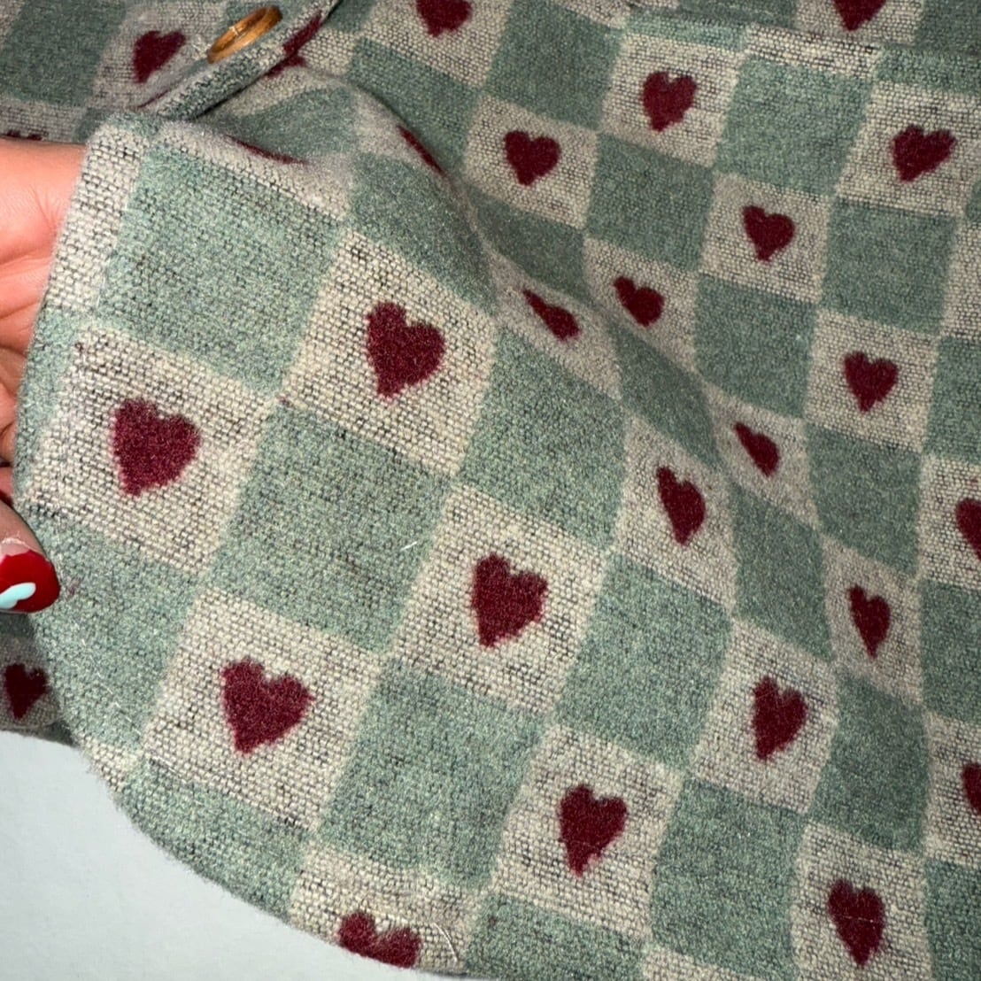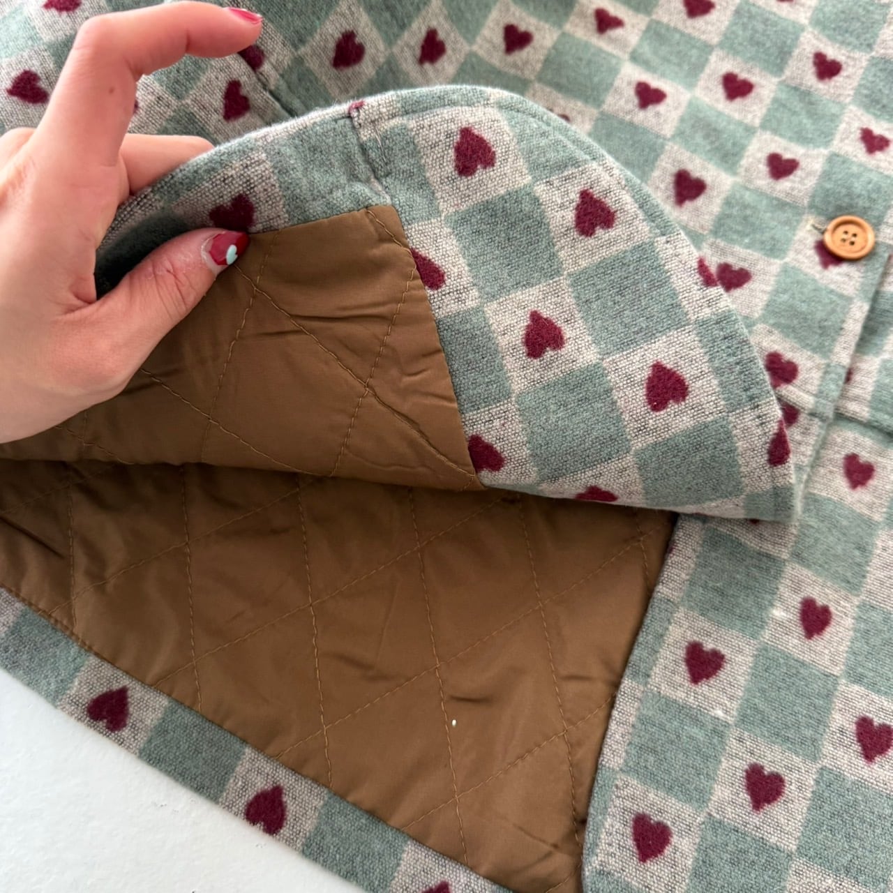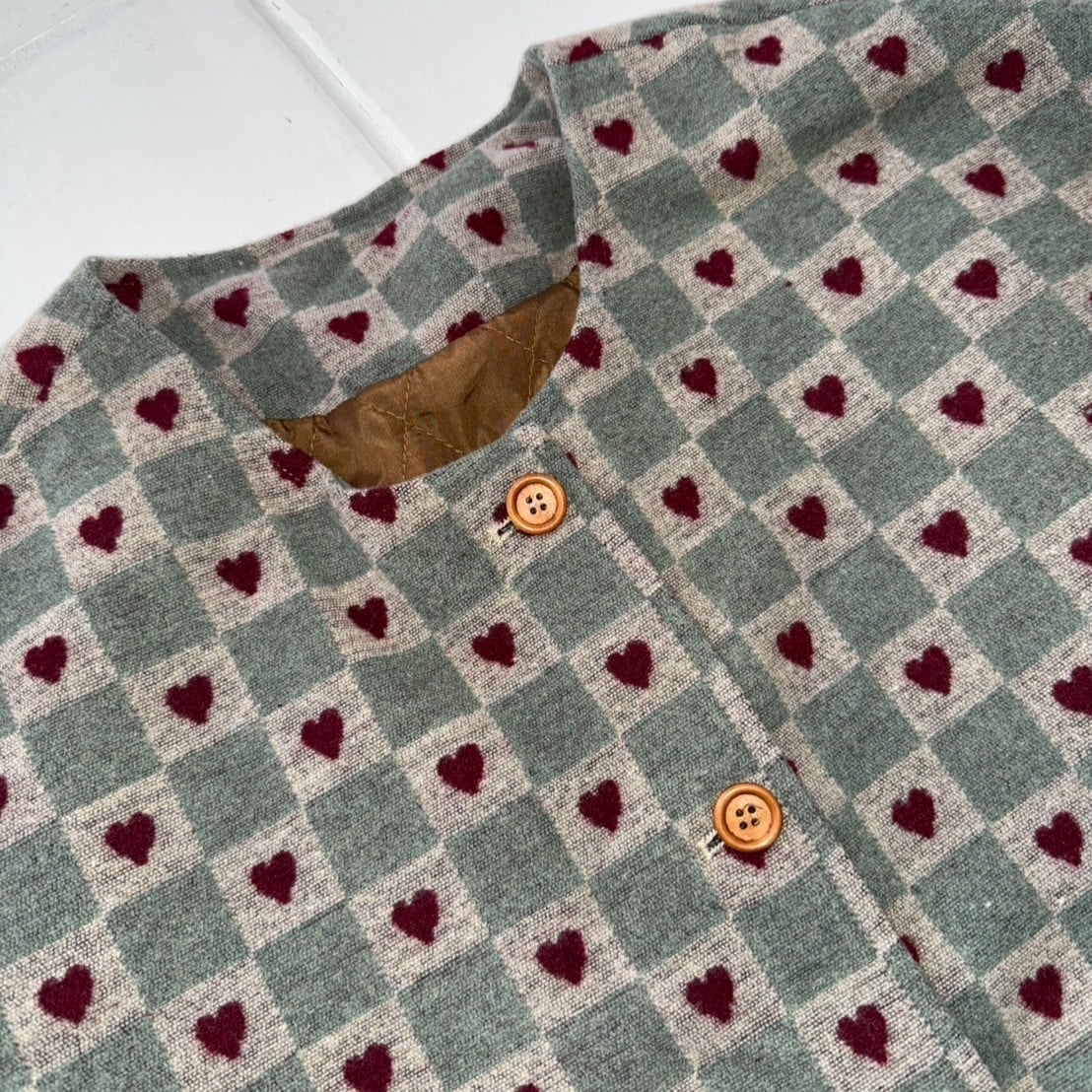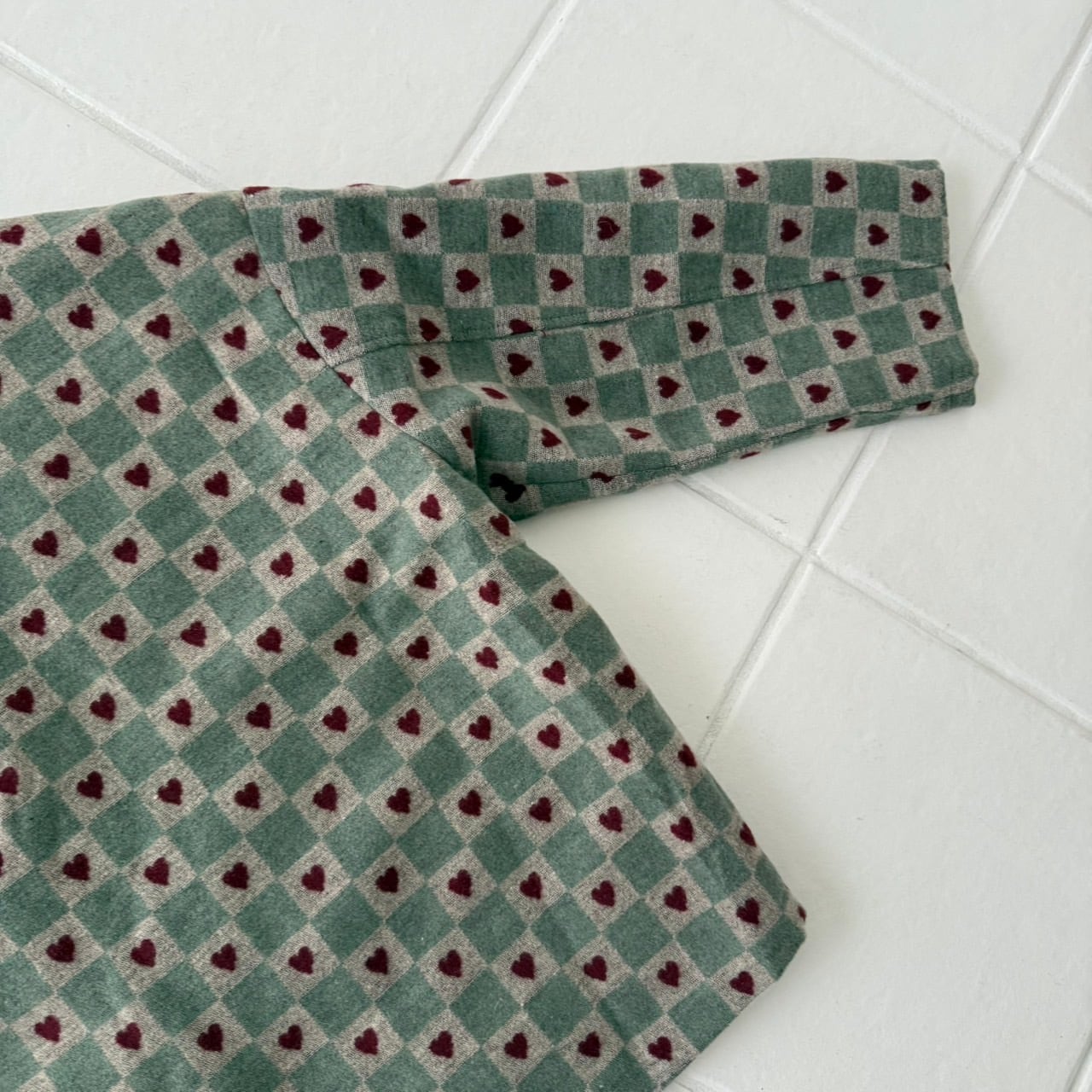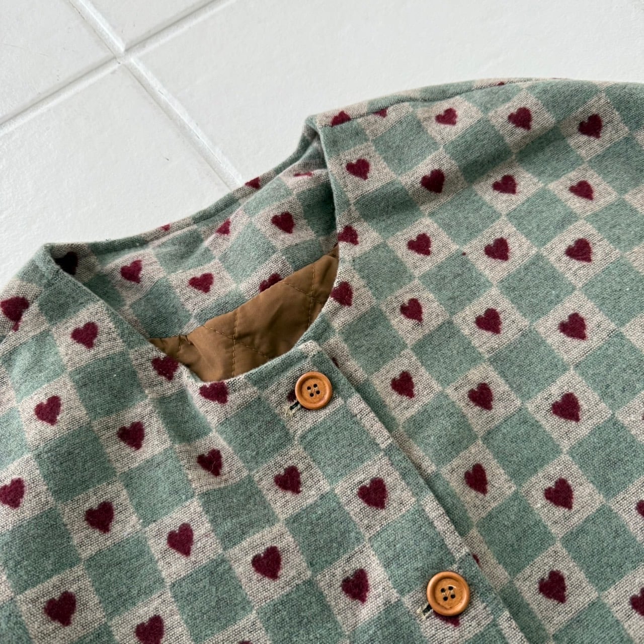 クラシカルなブロックチェックの中に、小さなハートを散りばめた個性的なテキスタイル。あえて少し“くすんだ”色味にすることで、甘くなりすぎず、ヴィンテージのお洋服のような独特の雰囲気に仕上げています。