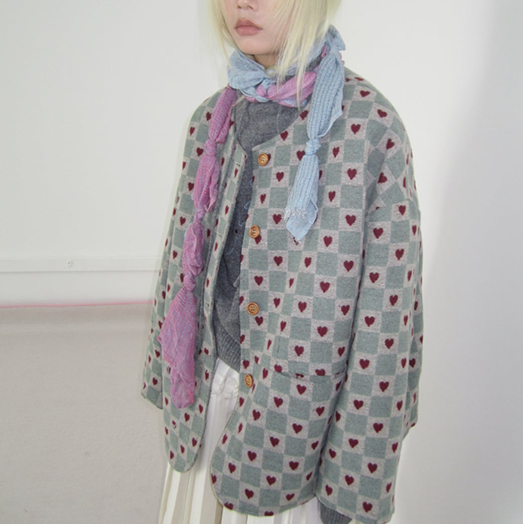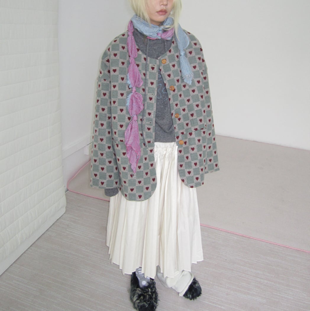 ゆったりとしたシルエットが魅力で、重ね着にも最適な丈感です。カラフルなハートチェッカーがコーデを楽しく見せてくれるので、寒い季節も気分が上がりました☺︎デニムやスカートなど様々なスタイルに合わせやすいので、コーデの幅を広げてくれそうです。