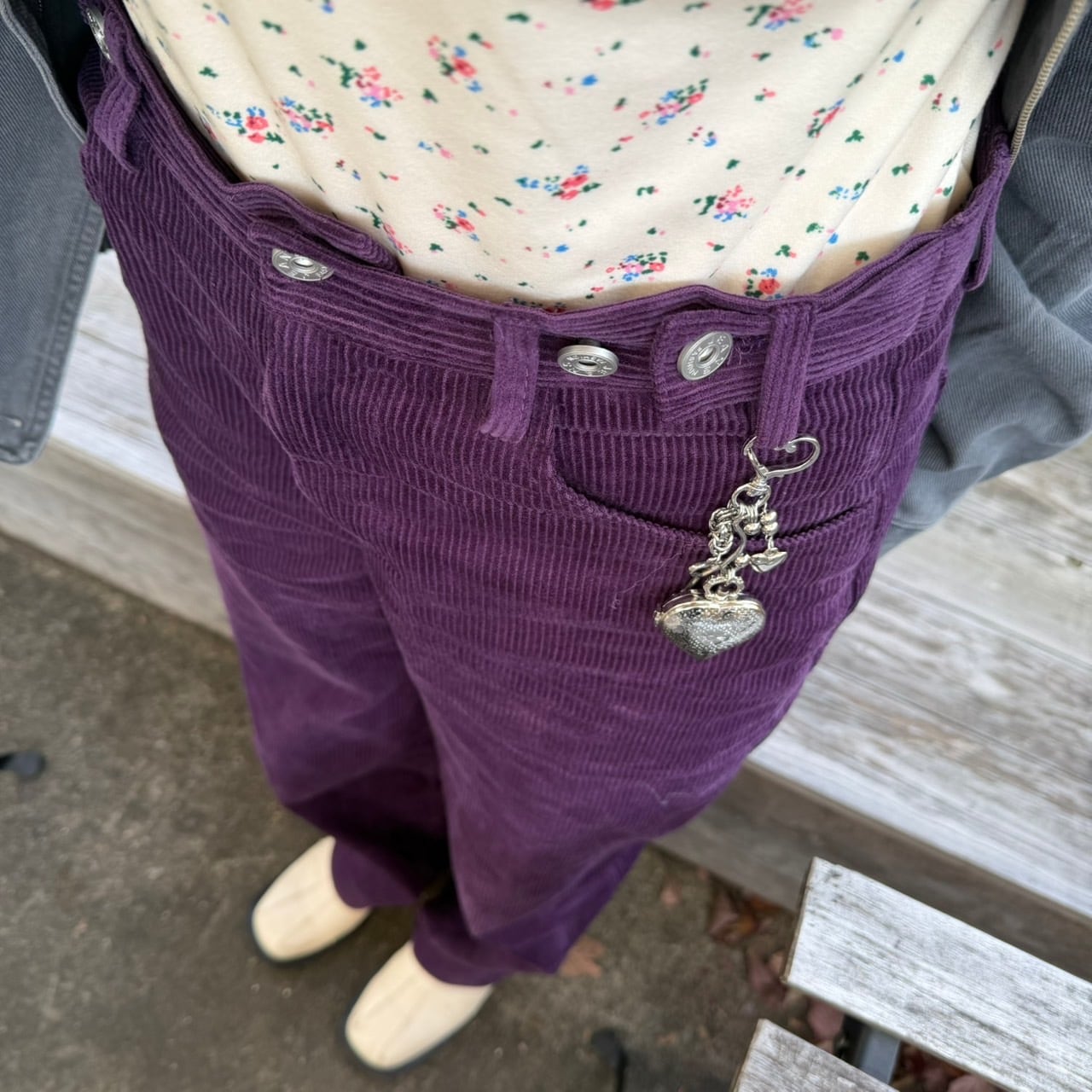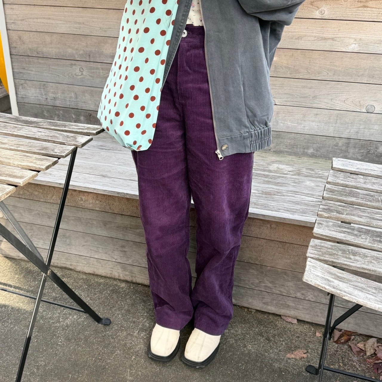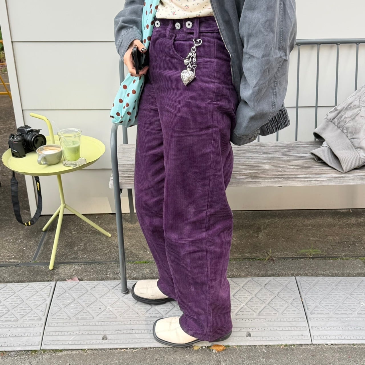 柔らかなコーデュロイ素材を使用したストレートパンツは、ボタンデザインがさりげないアクセント。