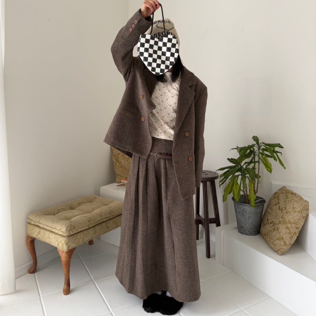 洗練された雰囲気を演出する、プリーツロングスカートとジャケットのセットアップです。