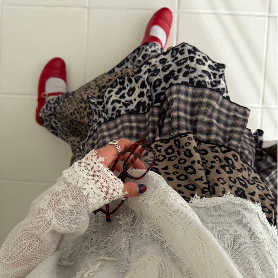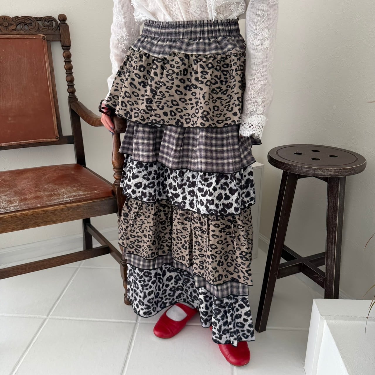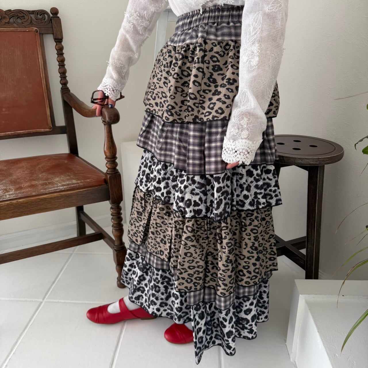 パッチワークレオパ柄ティアードスカート_LN03754★