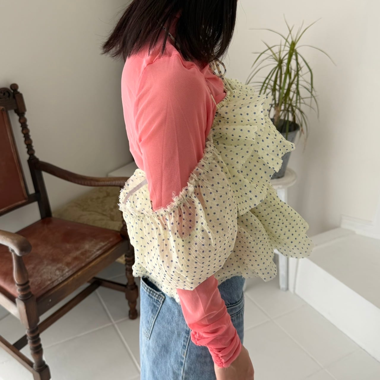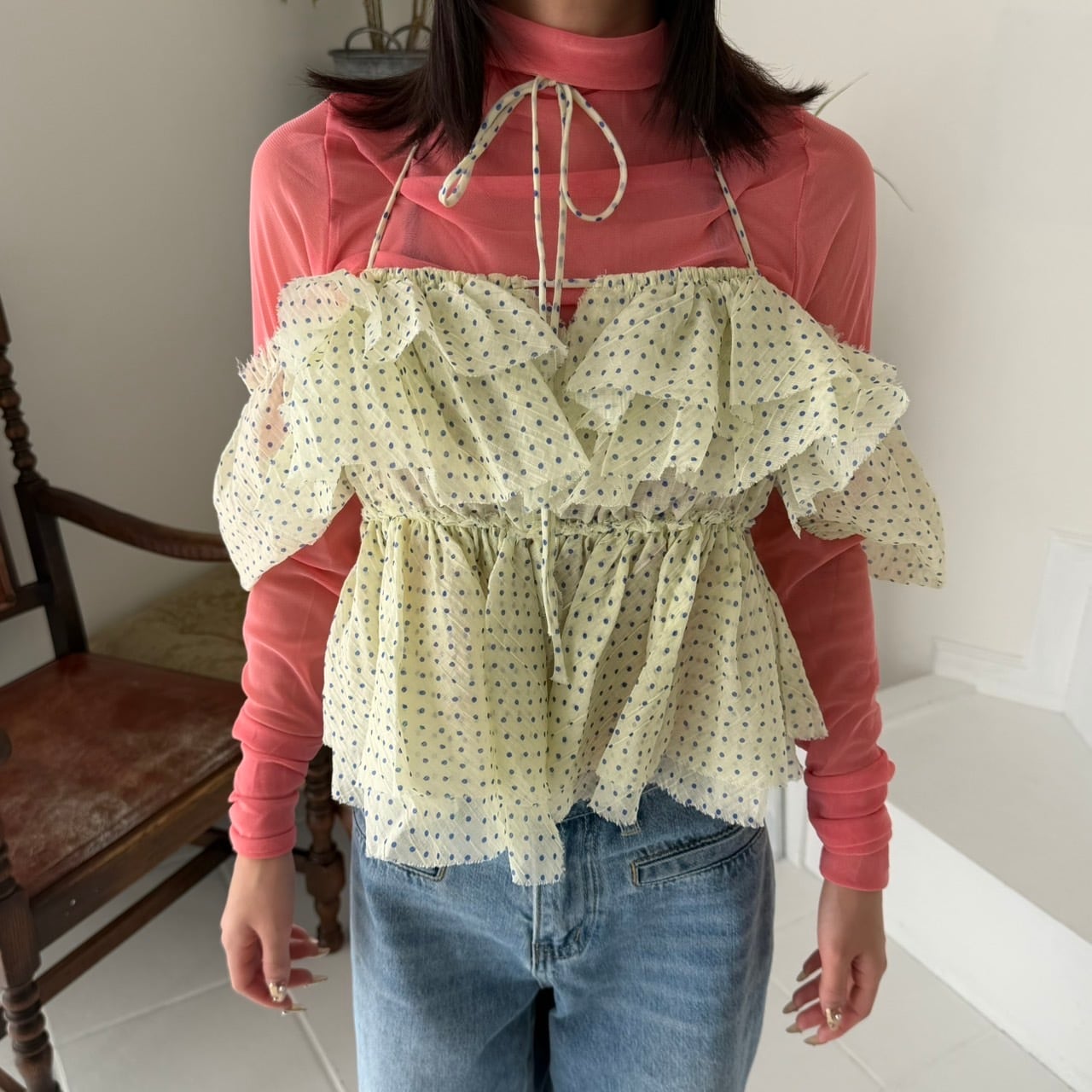 繊細なドット柄がプリントされたチュール素材をふんだんに使用。幾重にも重ねたフリルが、顔周りを華やかに、そして気になる二の腕やウエスト周りを自然にカバーしてくれます♡