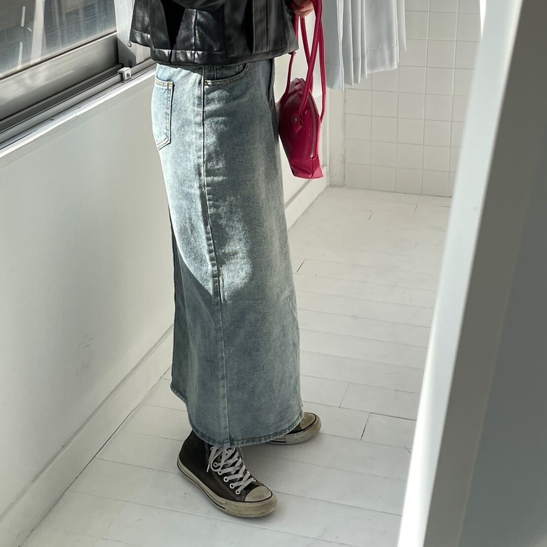 デニムスカートのカジュアルさと、スリットや、ピッタリとした腰回りで女性らしさを出せるアイテムです。
