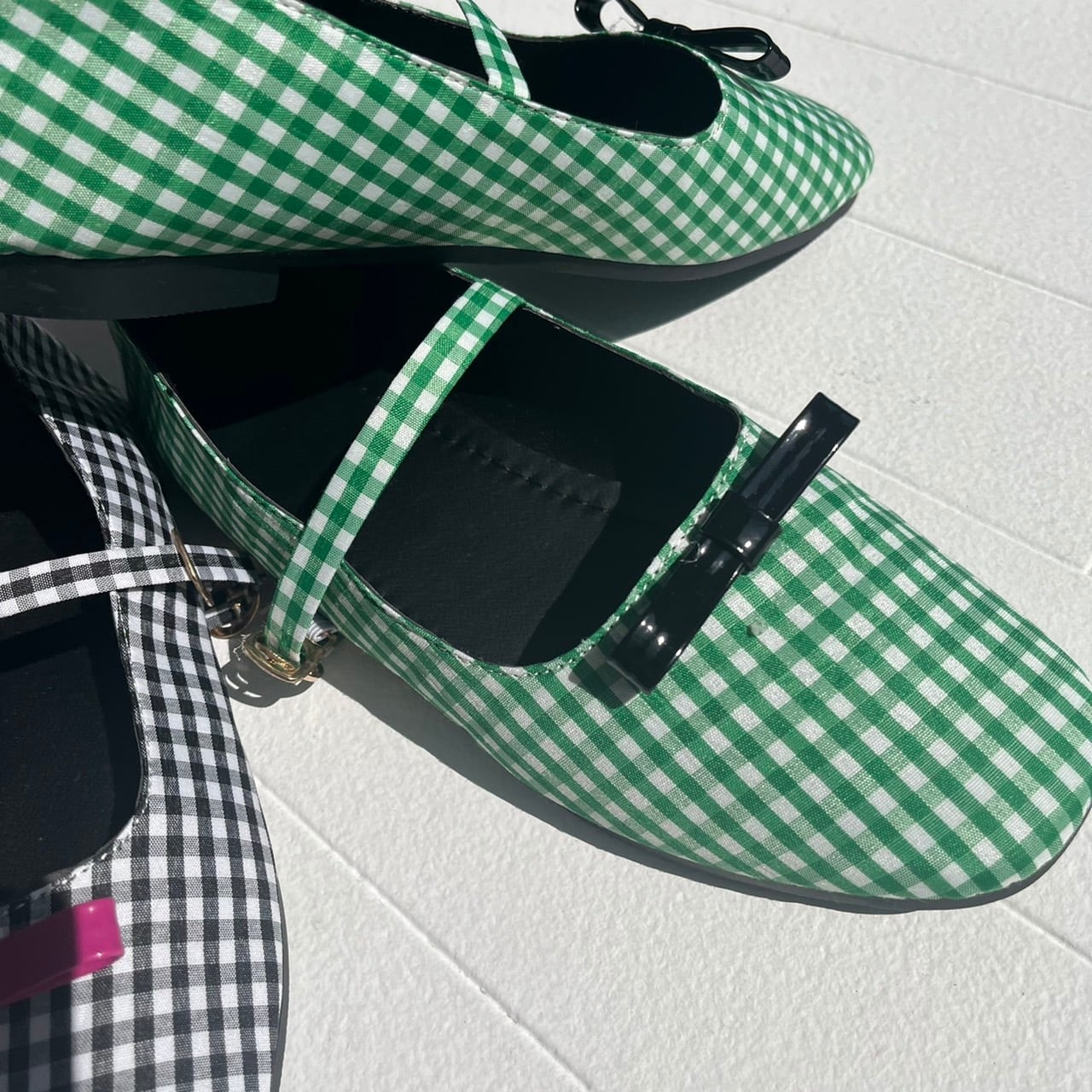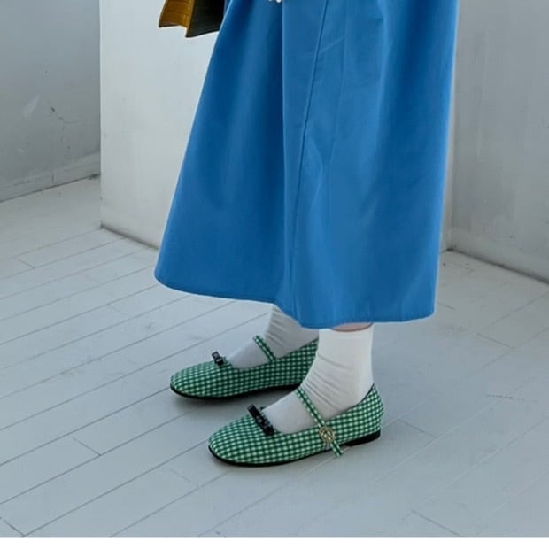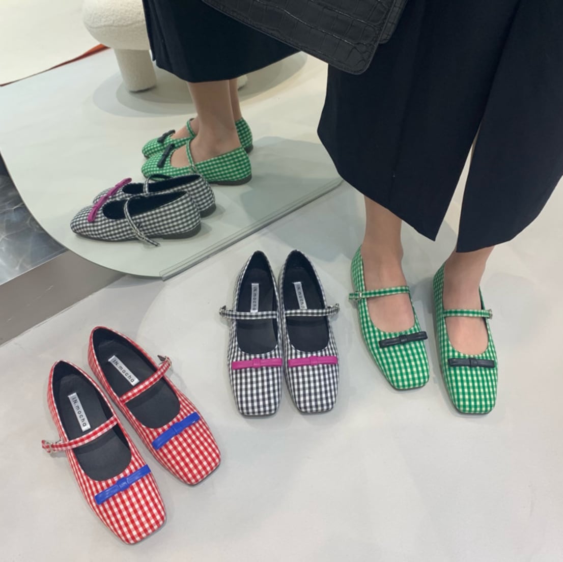 スクエアトゥギンガムチェックストラップローヒールパンプス_LN01091