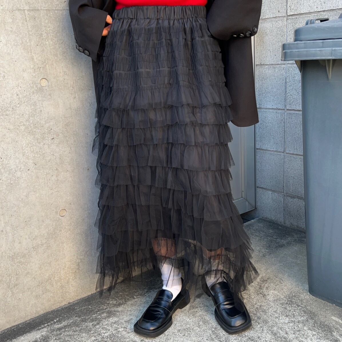 ヒップ下からの切り返しのため、ボリューミーになりすぎず、ストンとした形の大人なティアードスカートを表現してくれています♡
