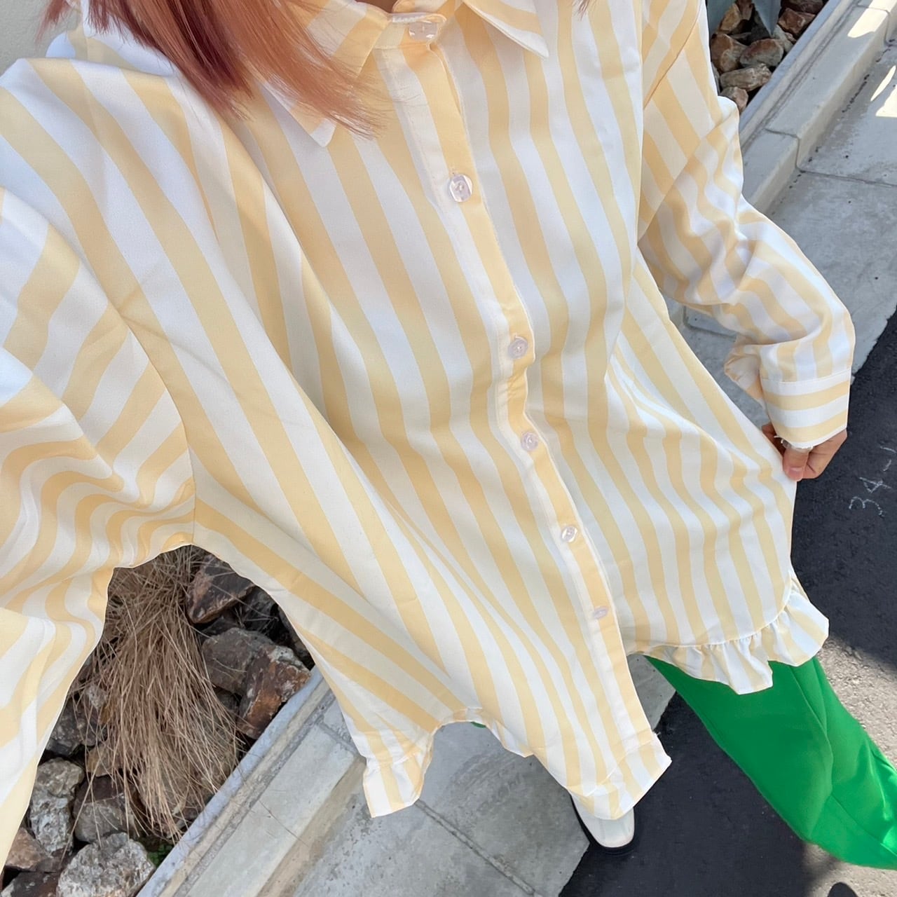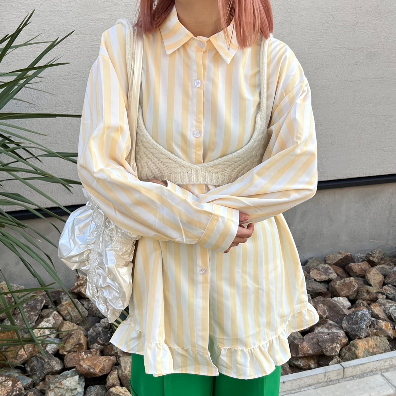 ストライプのシャツは少し硬派なイメージですが、大きさと裾のリブが可愛らしさを出してくれます♡
