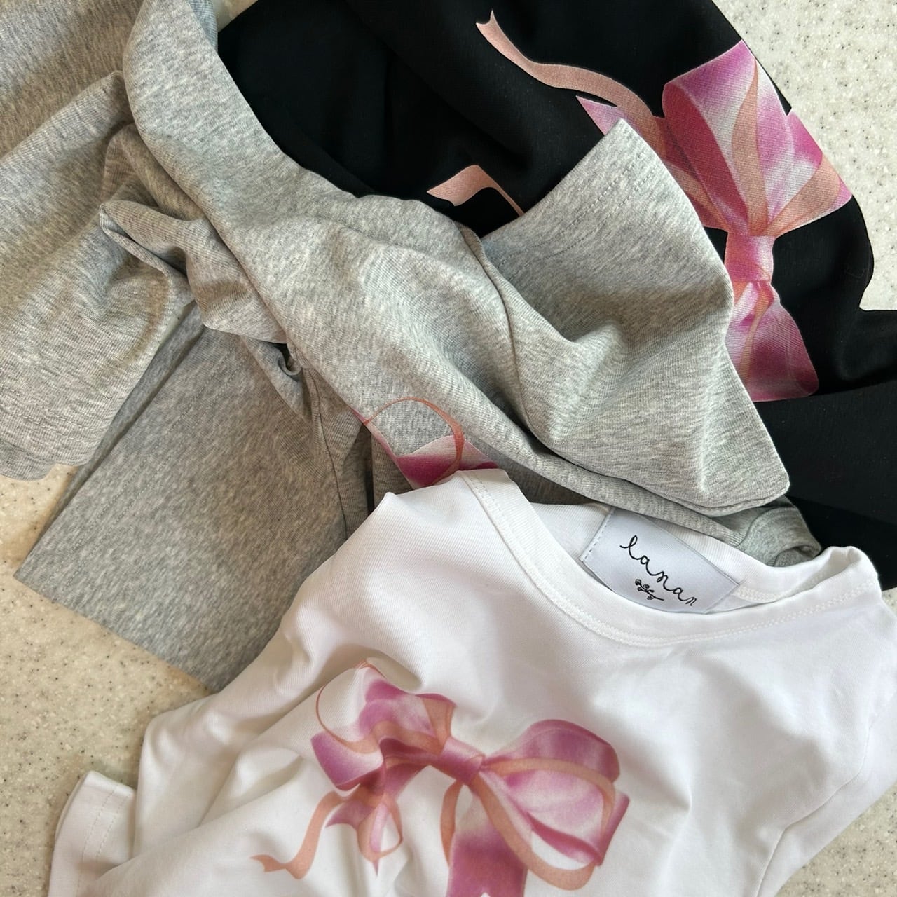 立体的なリボンをプリントした、インナーにももってこいの1枚。