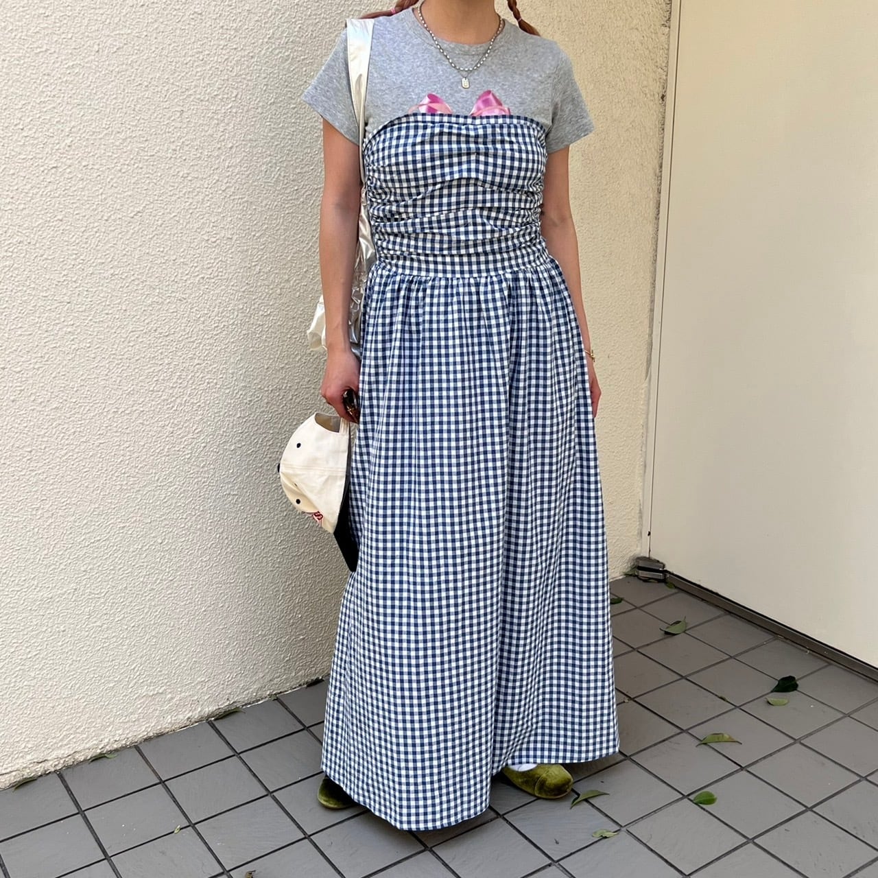 ギンガムチェック柄ショルダーレスボリュームワンピース_LN02781