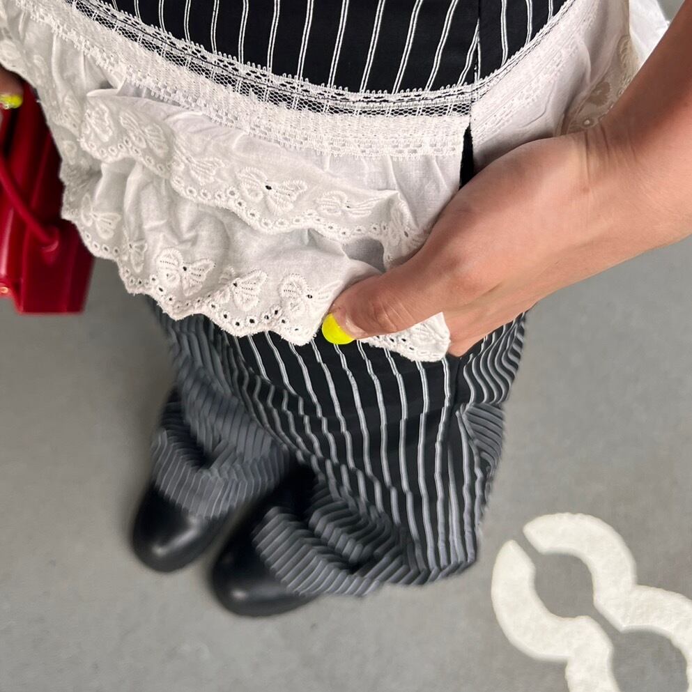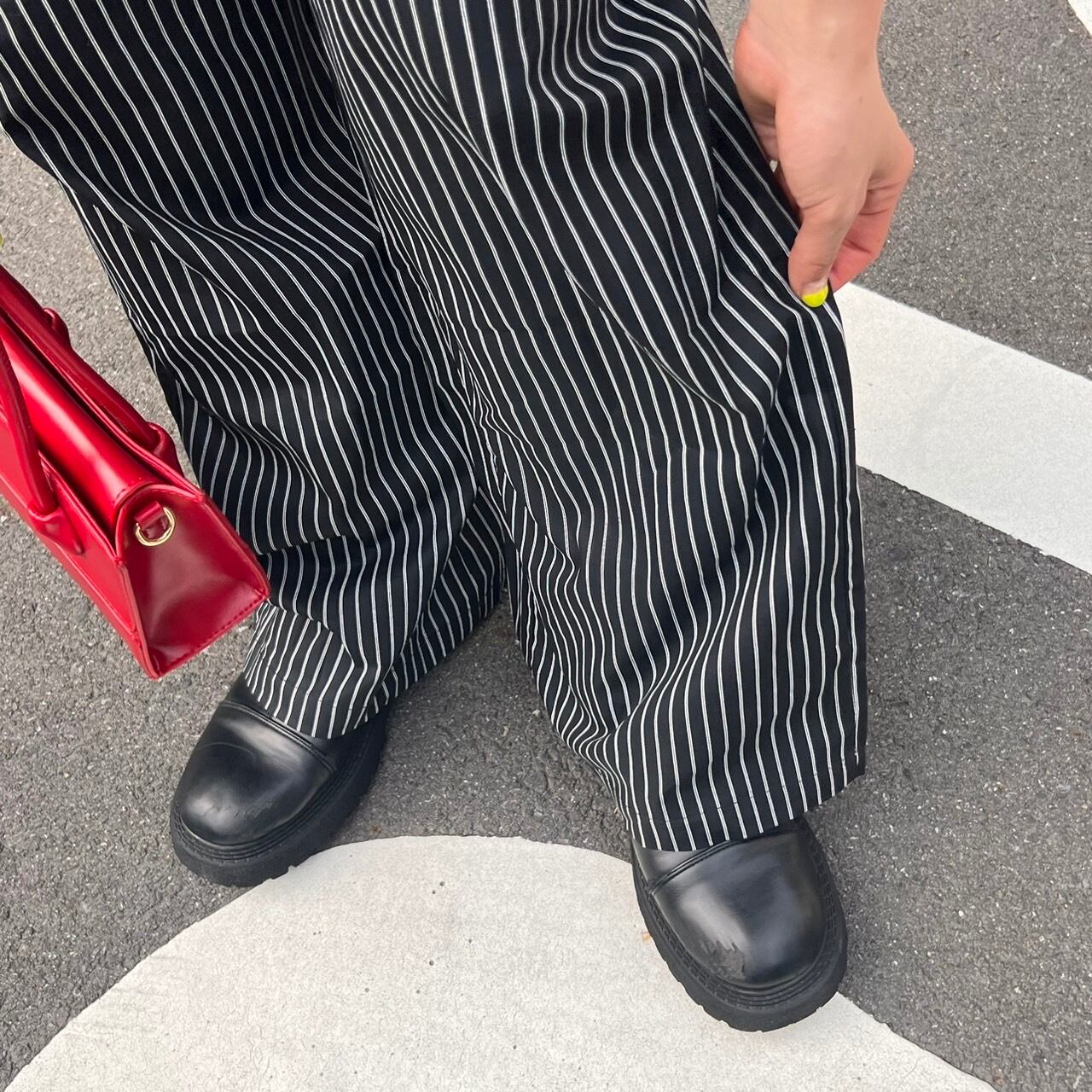 縦ラインのダブルのストライプとワイドなシルエットで、シトリーとな印象がありつつ、