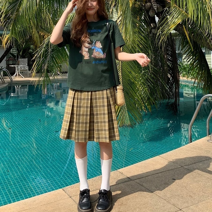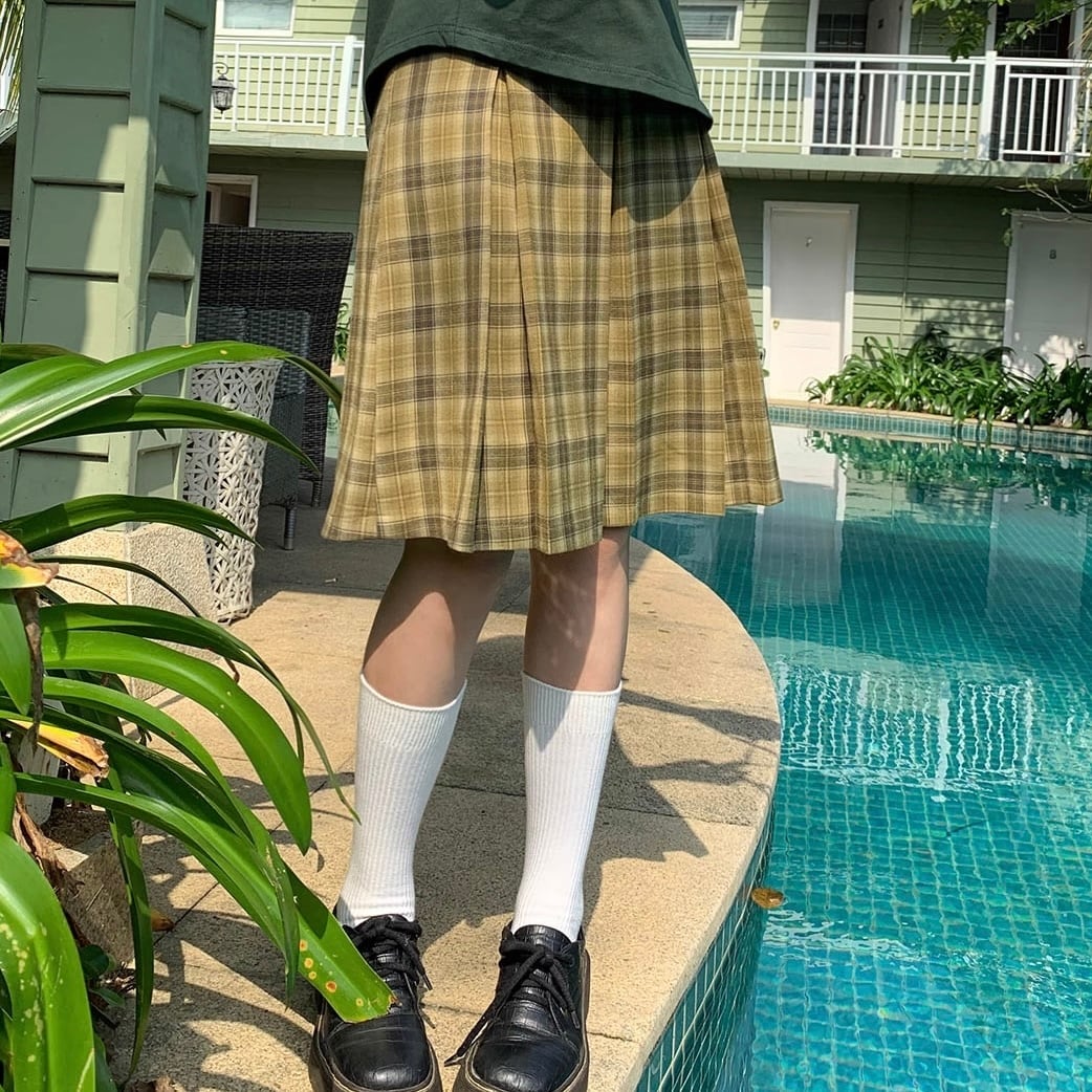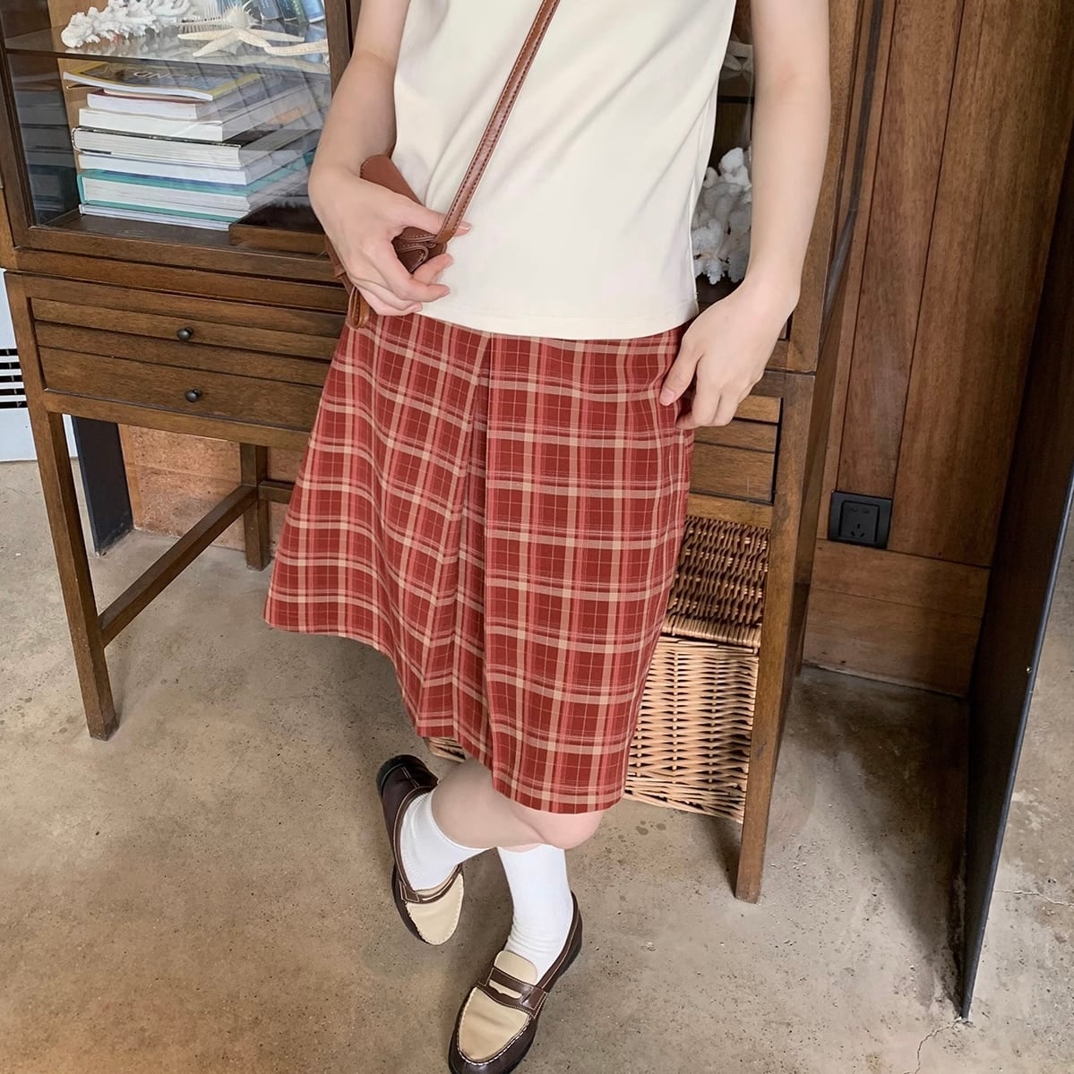 レトロなチェック柄とマッチしたミモレたけのスカートデザイン。