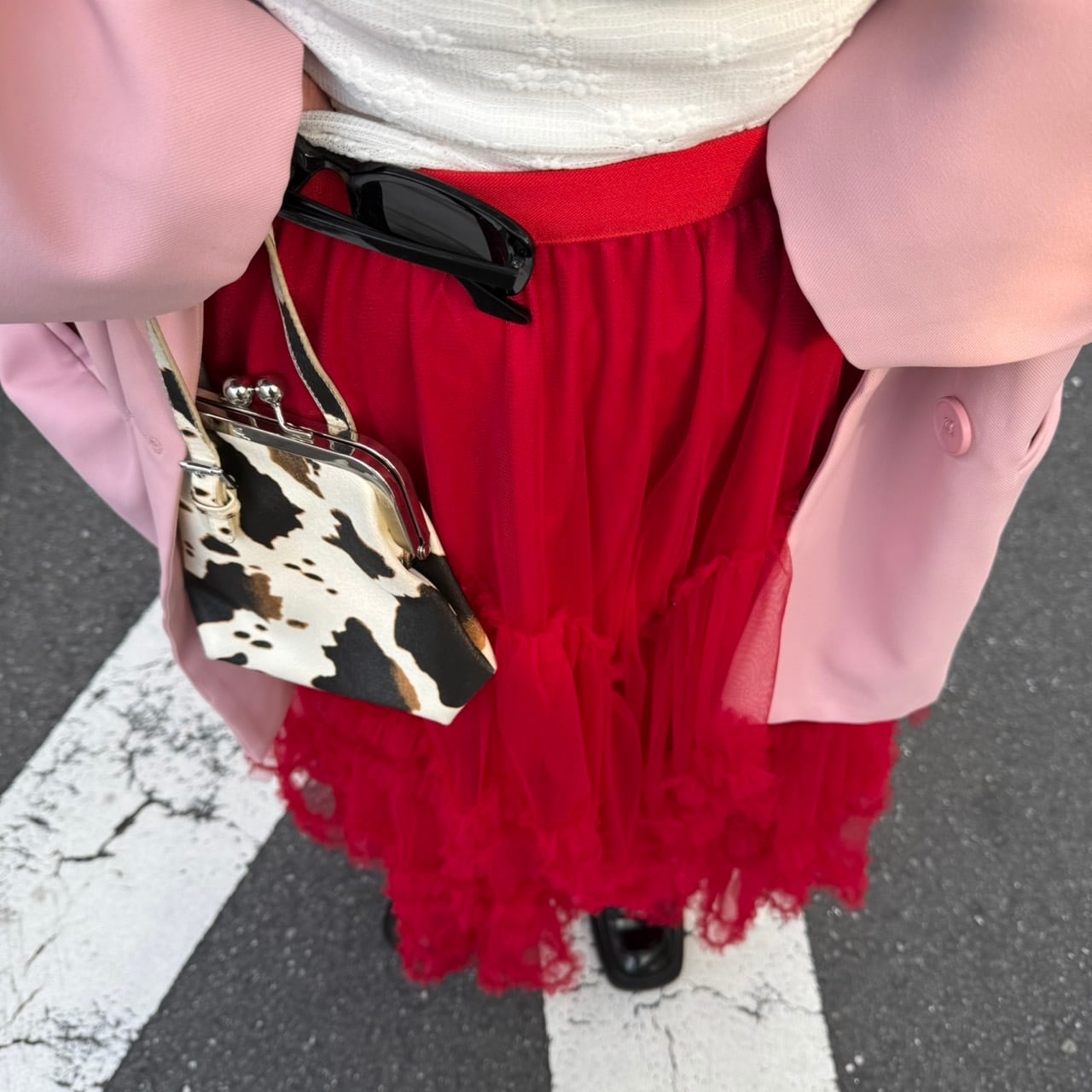ボリューム感のあるチュール素材を使用しており、動くたびに優雅に揺れるシルエットが魅力です。カジュアルなお出かけから式典などの特別な場面まで、さまざまなシーンで活躍するアイテムです。コーディネートに加えることで、瞬時に華やかさを演出します❤︎