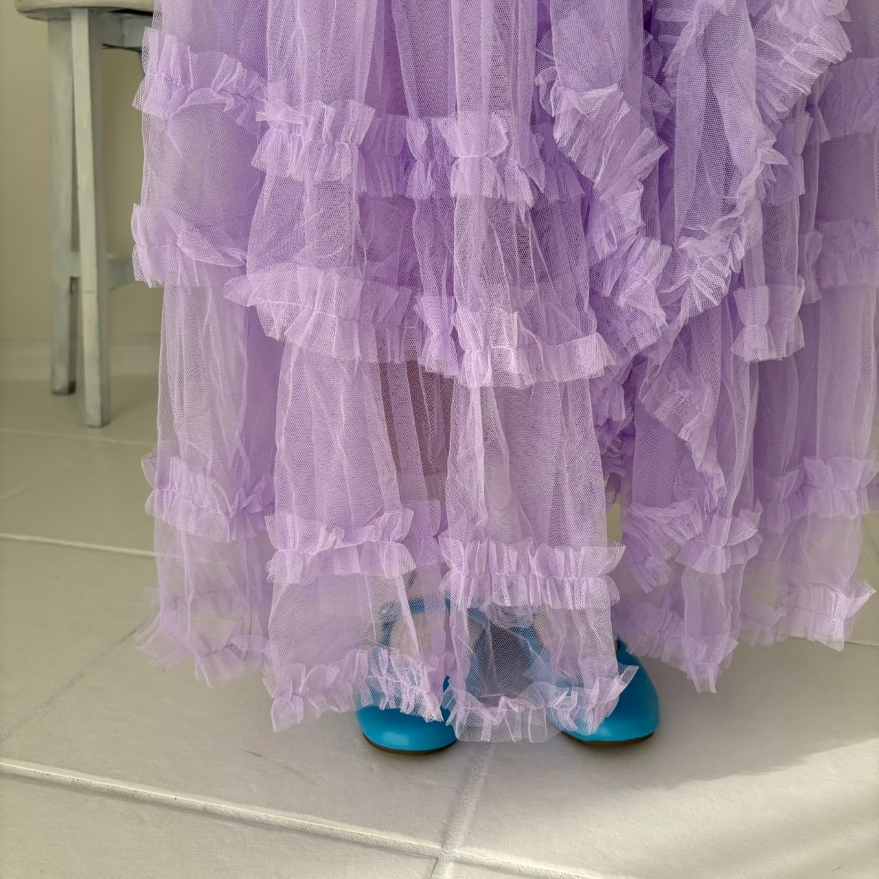 ボリューム感のあるチュール素材を使用しており、動くたびに優雅に揺れるシルエットが魅力です。カジュアルなお出かけからセレモニーなどの特別な場面まで、さまざまなシーンで活躍するアイテムです。コーディネートに加えることで、瞬時に華やかさを演出します❤︎